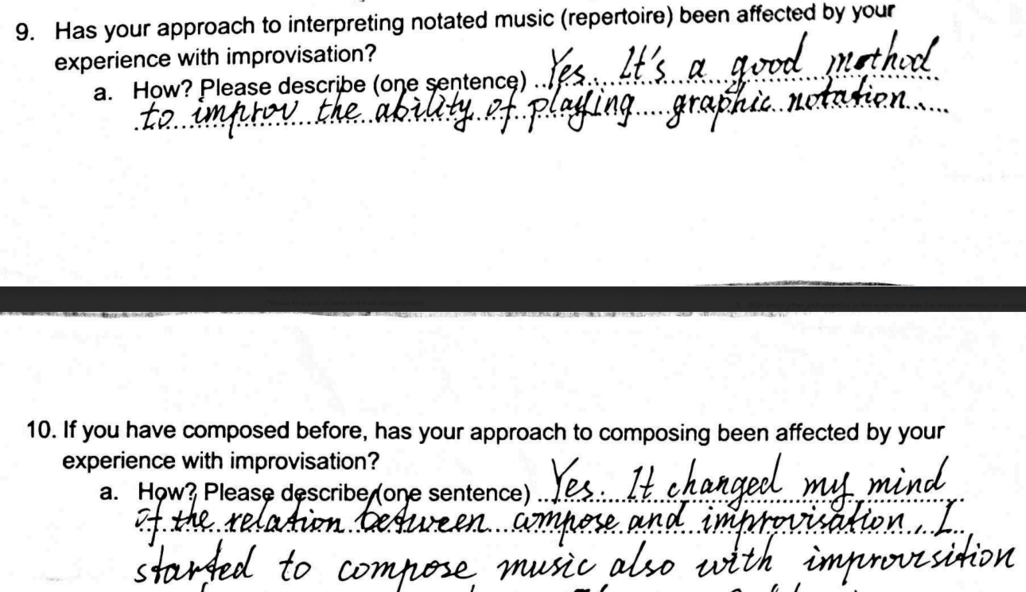 Image 2: Again, the picture shows a moment (screenshot from video) of a concert by the Ensemble Improvisation Experimentell. The graphic score, shown, expresses the listening experience by one of the members of the ensemble (shown on image 1b, far left), which was created as a mirror of another listeniong experience. In this picture, it is used as a visual stimulus for a new experience, a graphic score to create another improvisaton.