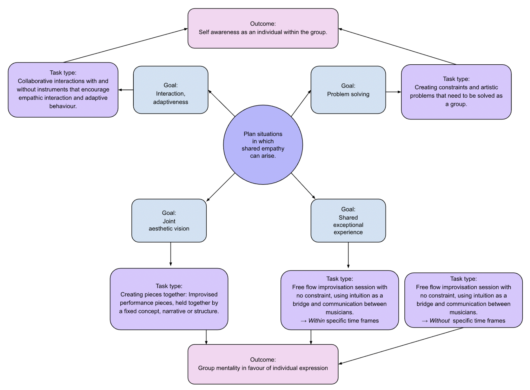 Artistic actions were devised and transmitted in the form of tasks with the aim of creating situations in which ‘shared empathy’ can arise within the group of musicians that are all at a high level of artistic proficiency. These focused on specific goals that were conceptualized exactly for this purpose. Figure 2 shows an example of the systematic structured framework developed during this study with five task types achieving the four goals. The goals and their task types can be interpreted in two categories: the task types designed to train interaction and adaptiveness as well as problem solving capabilities within the ensemble are geared towards improving self awareness as individuals within the group. Contrastingly, the other two task types designed to explore a joint aesthetic vision and bring about a shared (exceptional) experience favor group mentality and flow within the group over individual expression. Second person interviews with individual musicians and group discussions with re-lived experience explication in this study have shown the second category to have been successful in creating moments of shared empathy and even flow state as a group with a reduction in or loss in self awareness as an individual. The individualist category, on the other hand, was shown to help musicians, especially in early stages of the project, to improve their personal skill-sets for non-verbal communication and allow for moments of shared empathy and even flow state to occur in brief one-to-one interactions, favoring the focus on one other person and with a high level self-awareness over the common goal of the group.