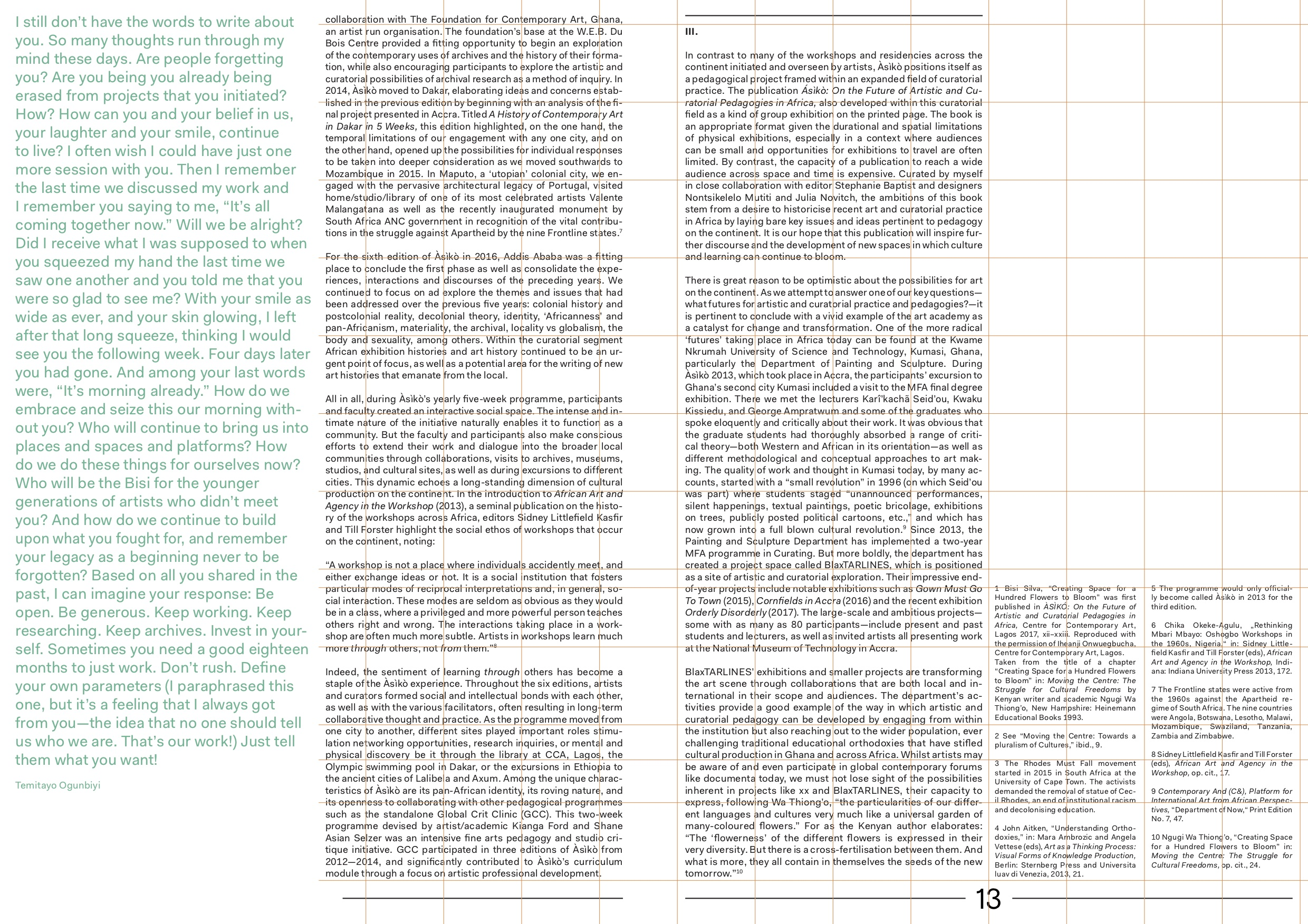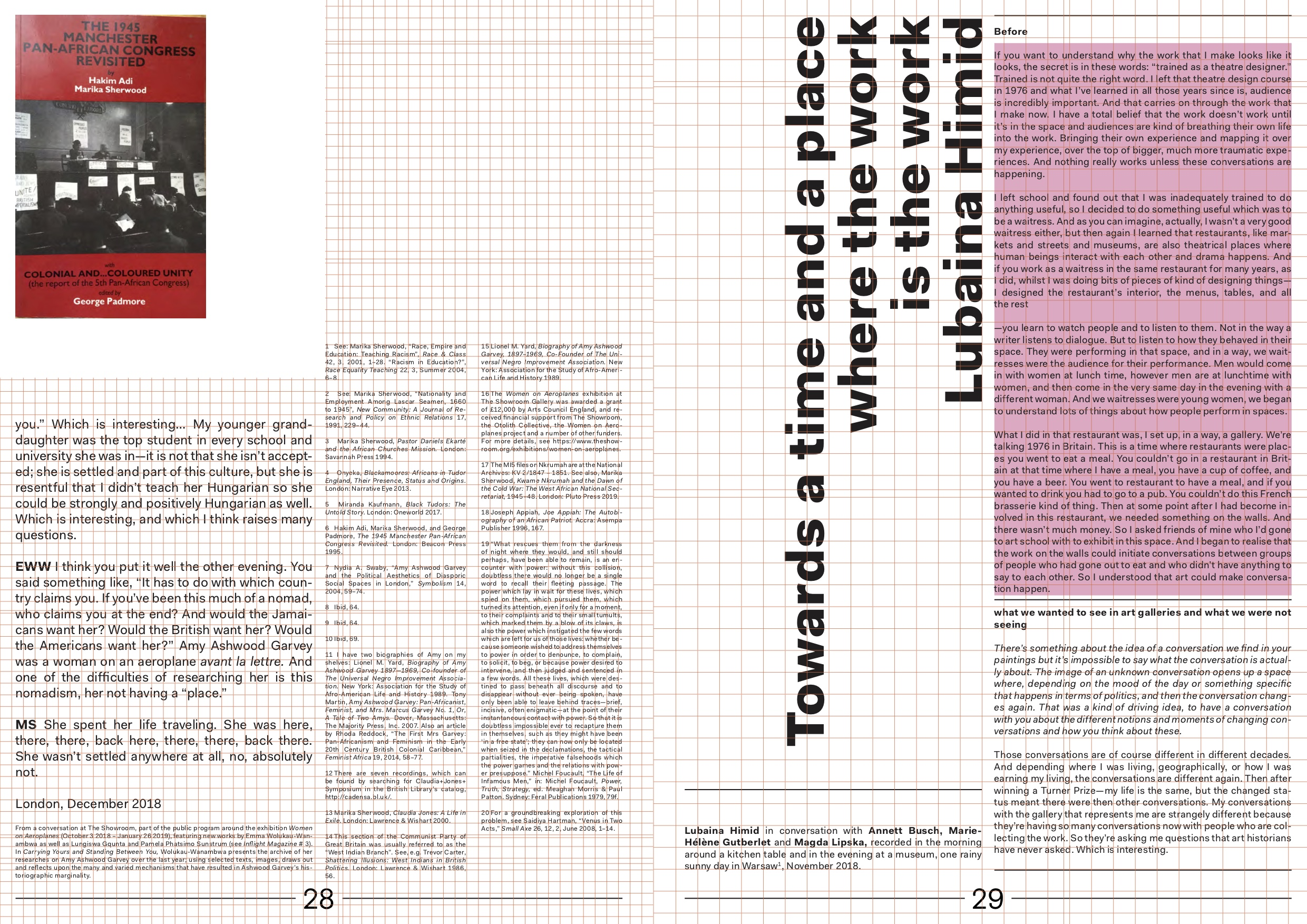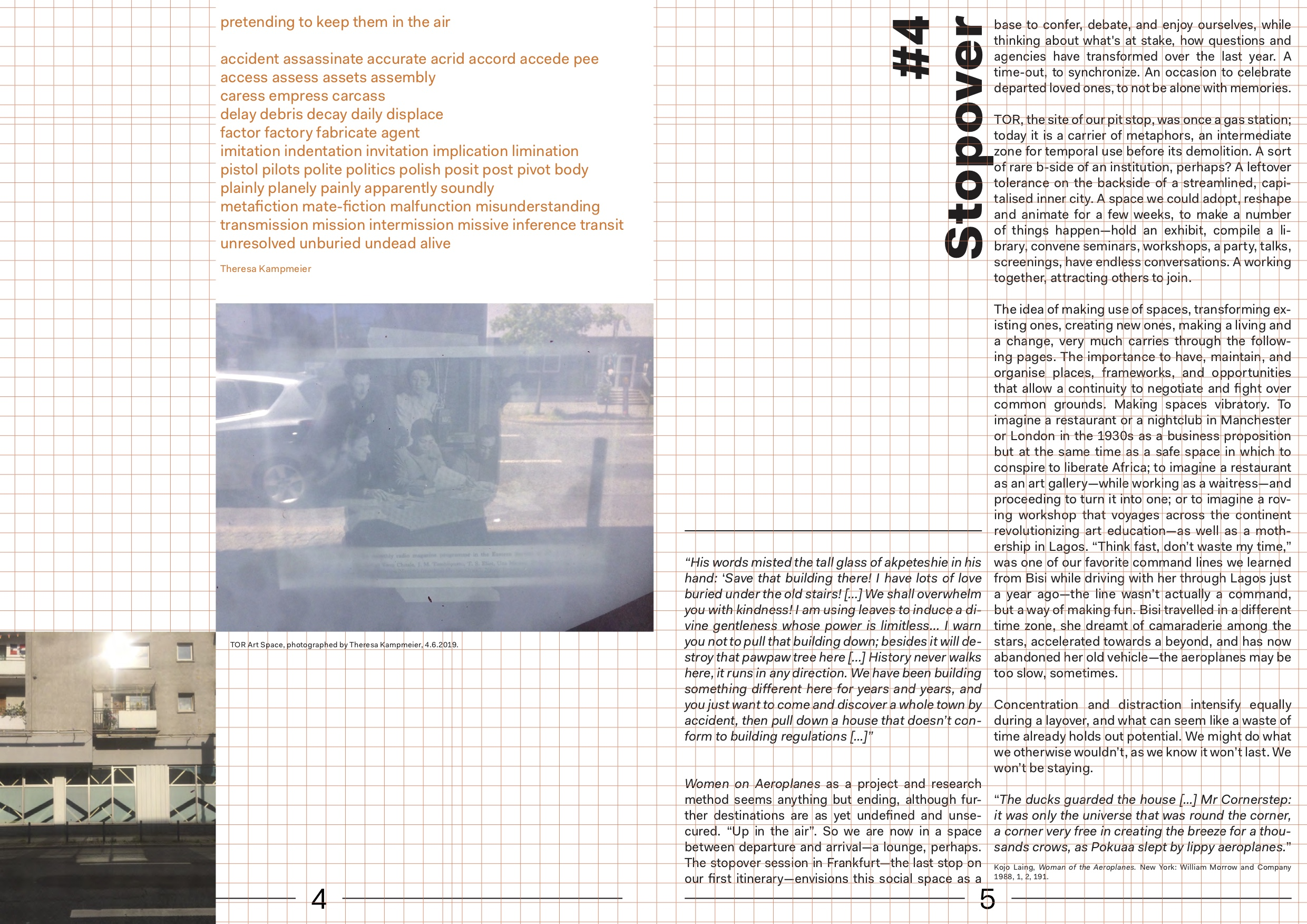 The idea of making use of spaces, transforming existing ones, creating new ones, making a living and a change, very much carries through the pages of Inflight Magazine #4. The importance to find, maintain and organise places, frameworks, and opportunities that allow for a continuity to negotiate, dispute, struggle over common grounds. Making spaces vibratory. With stopover conversations in Warsaw and London, thinking of the wonderful Bisi Silva who passed away while assembling this issue.