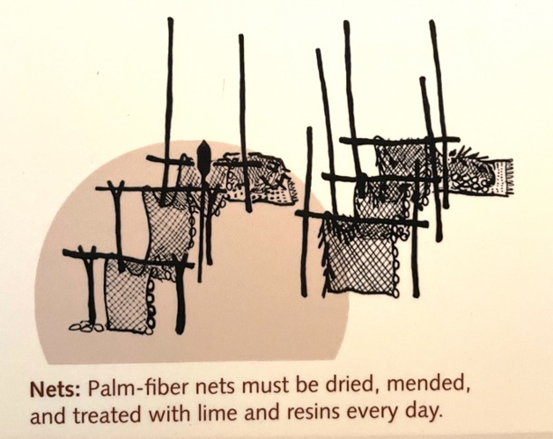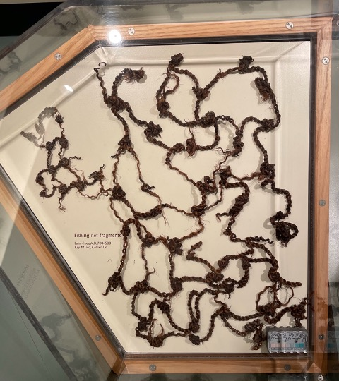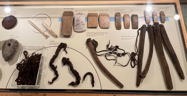 Fishing net fragments excavated in Calusa villages, care and maintenance instructions, and tools employed to make the nets.