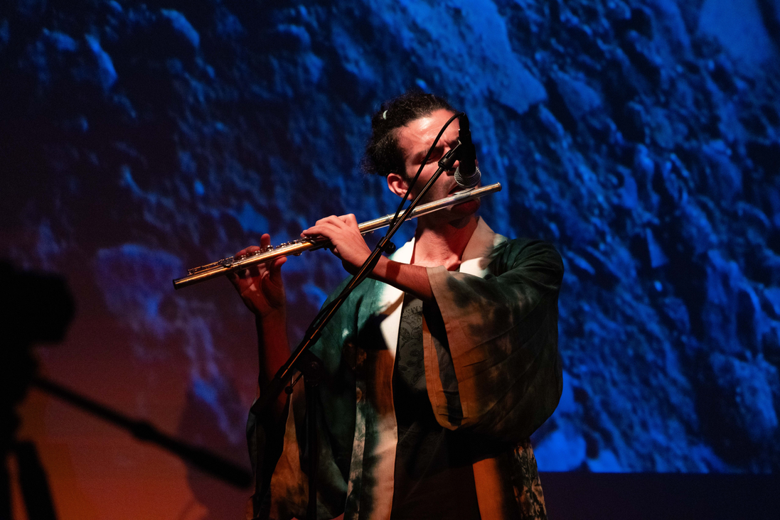 L is a musician, composer, visual artist, and inventor; trained in classical flute, jazz composition, and arrangement, during his career, he has been working in various experimental and genre-breaking contexts spanning improvisation, chamber music, electronics, noise, meth-metal, installation, and performance. In his praxis, he pushes boundaries searching for new personal solutions in practical and conceptual ways. His sound surfaces from a unique and inordinate working process in which sonic material from various traditional classical instruments are shredded, forced into feedback loops, and mixed with recordings of crashing software, futuristic self-built instruments, and tender manual processing. He creates his own sound path, improving his prototypes of extended flute (Flaubosax), no-input flute to broaden the sound possibilities beyond the physical limits of the instrument, exploring new musical possibilities;