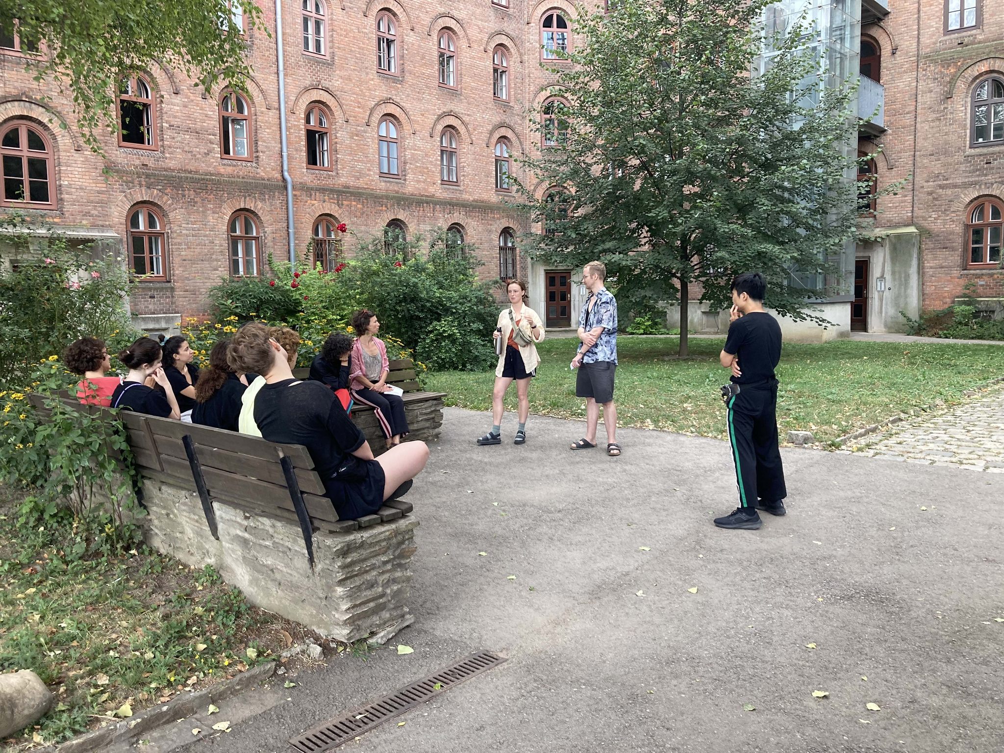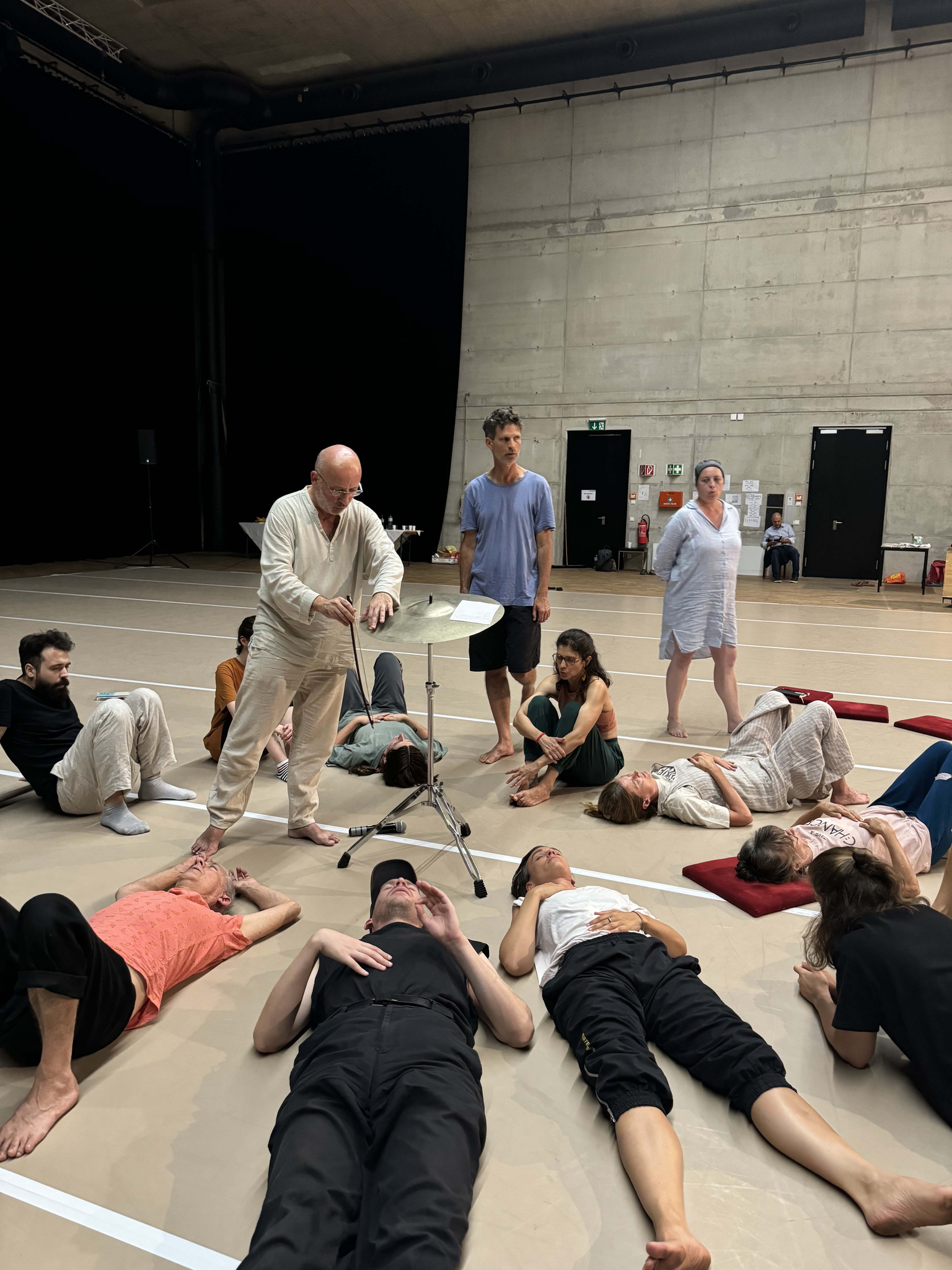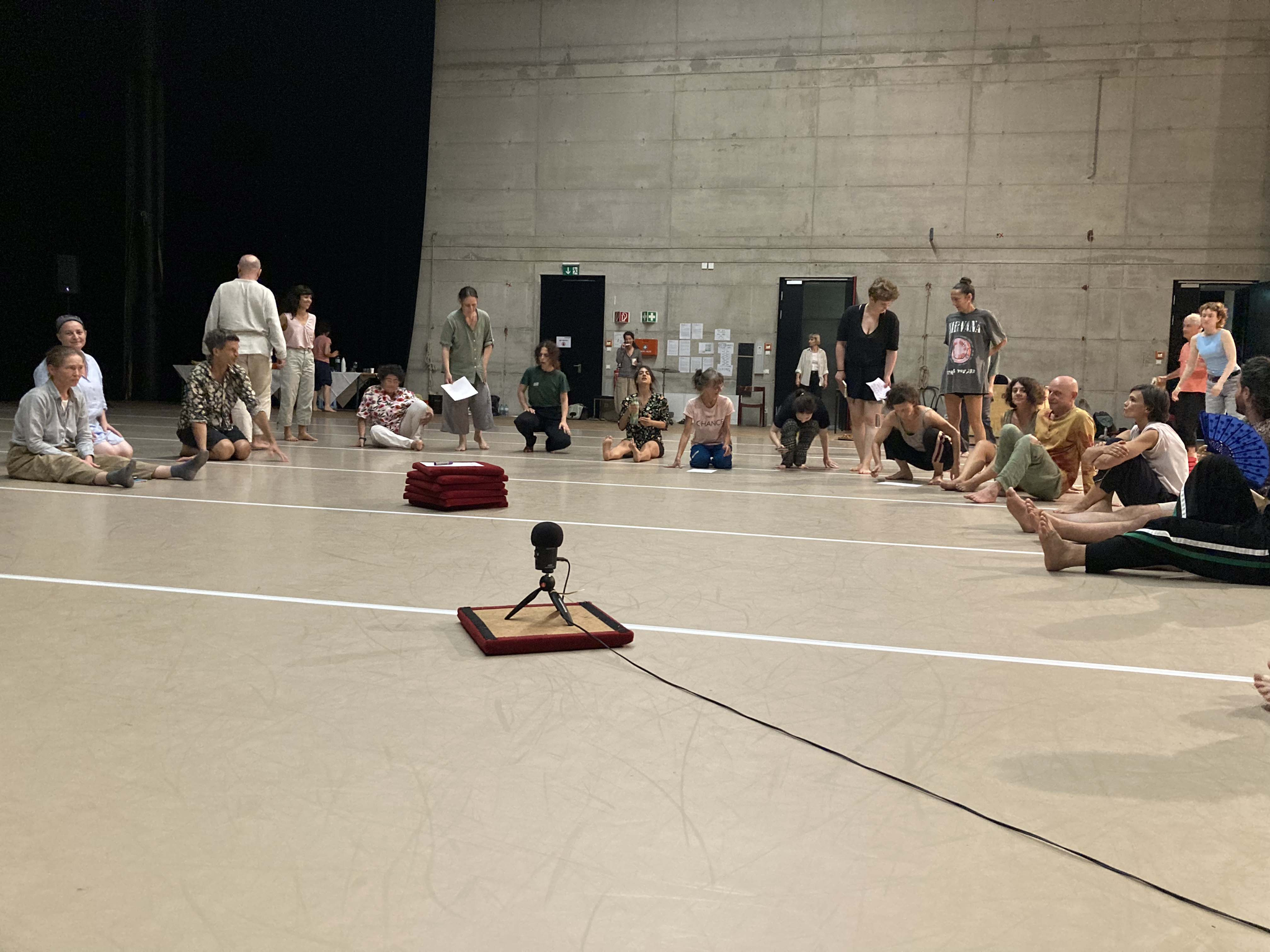 The workshop Catalin Cretu, Andrea Duta and Jan Burkhardt facilitated started with the practice of listening and positioning oneself to the source of sound, and letting oneself be touched and moved by it. Already this exercise created choreographic- compositional constellations that made the transition into sensing and moving from, with and into fields of resonance very organic. „Fields of resonance“ here means a space ( often between 2 or more bodies, but also between bodies and objects, or features of the space, and similar regarding renounce in time, a time span between 2 moments, that are filled with more intensity, more vibrancy, more vitality and potential than conventional fields of space and time. These intensities or vibrancies can be objectively measurable, but also subjectively experienced - or anything in between.