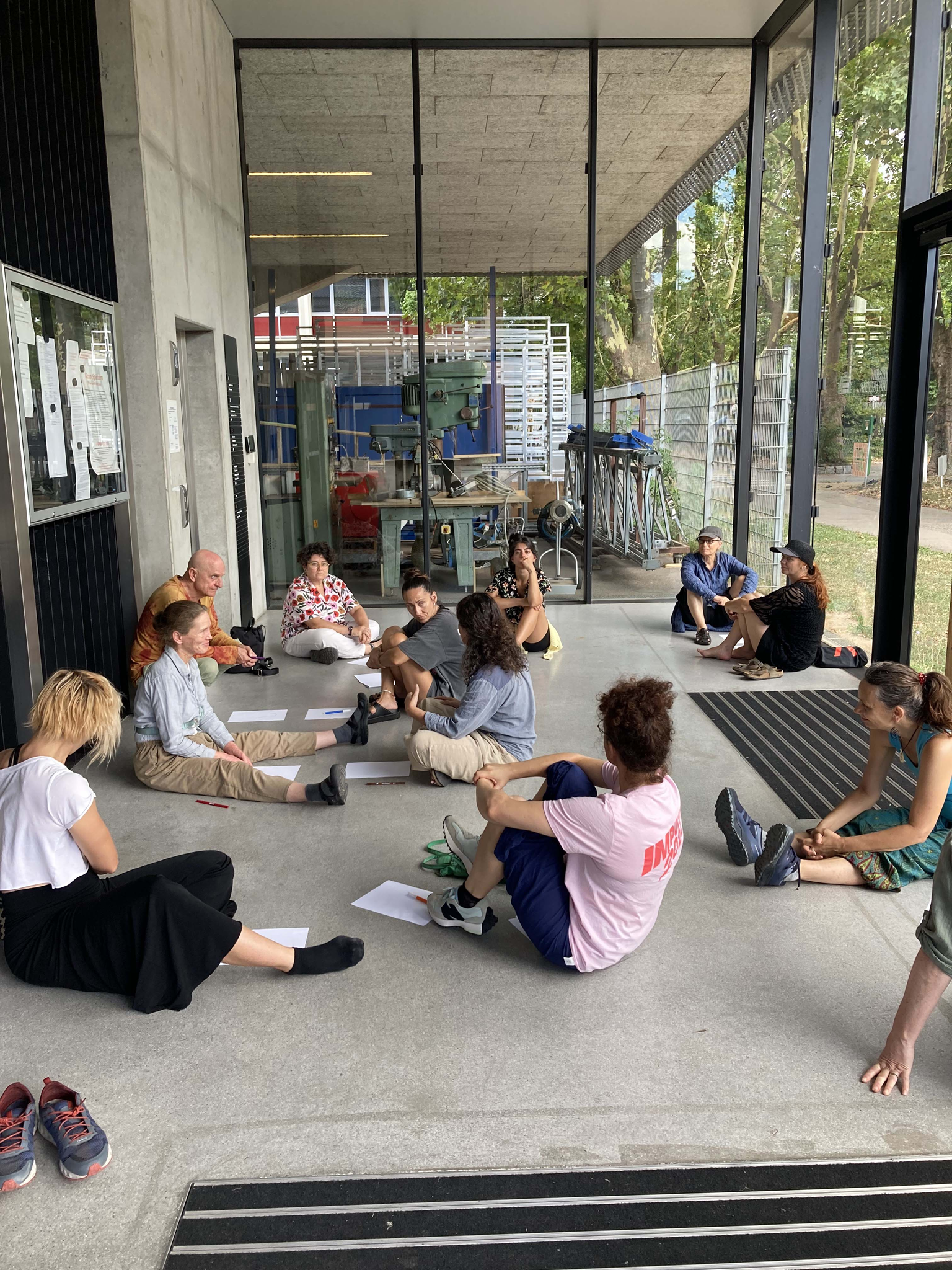 The workshop facilitated by Vera Sanders, Evita Tsakalaki and Stella Malliaraki drew on learning methods and tools from the Cologne and Crete encounters. The three facilitators worked complementary to each other starting from a score that used observation and drawing, moving on to open questions about love, attention, care and finishing with a suggestion on what sort of boundaries we set as individuals and as communities and how these can be expressed through our bodies.
