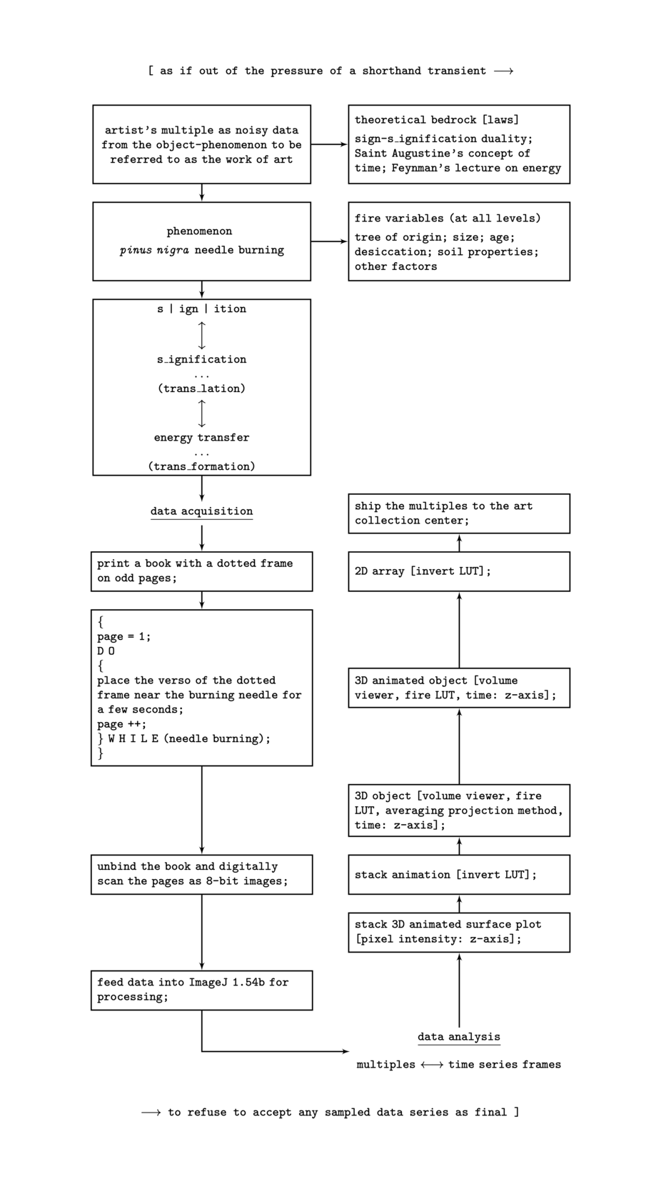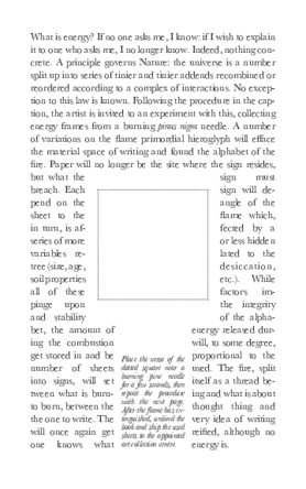 What is energy? If no one asks me, I know; if I wish to explain it to one who asks me, I no longer know. It is, indeed, nothing concrete—only a principle that governs Nature. The universe is a number split up into an endless series of smaller and smaller addends, continuously recombined or reordered according to a complex of interactions. No exception to this law is known. Following the procedure in the caption, the artist is invited to experiment with this principle by collecting energy frames from a burning Pinus nigra needle. Through a series of variations on the flame’s primordial hieroglyph, the material space of writing will be effaced, giving rise to an alphabet of fire. Paper will no longer be the site where the sign resides, but what the sign must breach. Each sign will depend on the angle of the sheet in relation to the flame, which, in turn, is affected by a network of more or less hidden variables intrinsic to the tree (size, age, desiccation, soil properties, etc.). While all of these factors impinge upon the integrity and stability of the alphabet, the amount of energy released during combustion will, to some degree, be stored in—and remain proportional to—the number of sheets used. The fire, split into signs, will establish itself as a thread between what is burning and what is about to burn, between the thought-thing and the one yet to write. The very idea of writing will once again get reified, although no one knows what energy is.