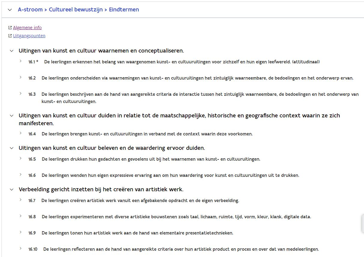 Er is een grote onderwijsvernieuwing geweest op 1 september 2019 met nieuwe eindtermen voor de 1ste graad van het secundair onderwijs. De taxonomie van Bloom groeide uit tot een belangrijk communicatiemiddel binnen het onderwijs. Eind jaren negentig werd deze taxonomie herzien o.l.v. David Krathwohl en Lorin Anderson, twee gezaghebbende onderwijspsychologen. Eindtermen werden verdeeld in 16 sleutelcompetenties en waarvan nummer 16 (cultureel bewustzijn) voor de kunstvakken is. Deze eindtermen zijn dus dezelfde voor A- en B-stroom maar zijn ook niet vakgebonden. Dat wil dus zeggen dat je deze eindtermen kunt bereiken door muzikale- en/of plastische opvoeding, maar het kan ook door één van de twee vakken behaald worden. Men is dus niet meer verplicht om de twee vakken in te richten.