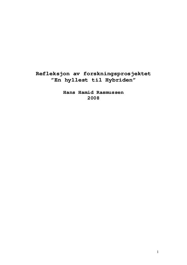 The aim of the research project, ”Homage to the Hybrid”, is to look into intercultural experiences and see how they can be expressed through visual art. To be able to do so, I have attempted to develop a way of thinking based on memories from the time just after I came to Norway from Alger at the age of around seven. I made journey to Alger a few years before the research period, and a second journey that was done later as part of the research. The ideas that formed in the wake these journeys have also been an important point of departure These ideas have mainly been expressed through my artworks, and in the following I will attempt to elaborate these visual ideas in the form of a written reflection. The artworks are all executed in textile material, where I have applied digital machine embroidery and hand embroidery. The written reflection aims at describing how visual and theoretical ideas together can form the basis for an artistic expression.