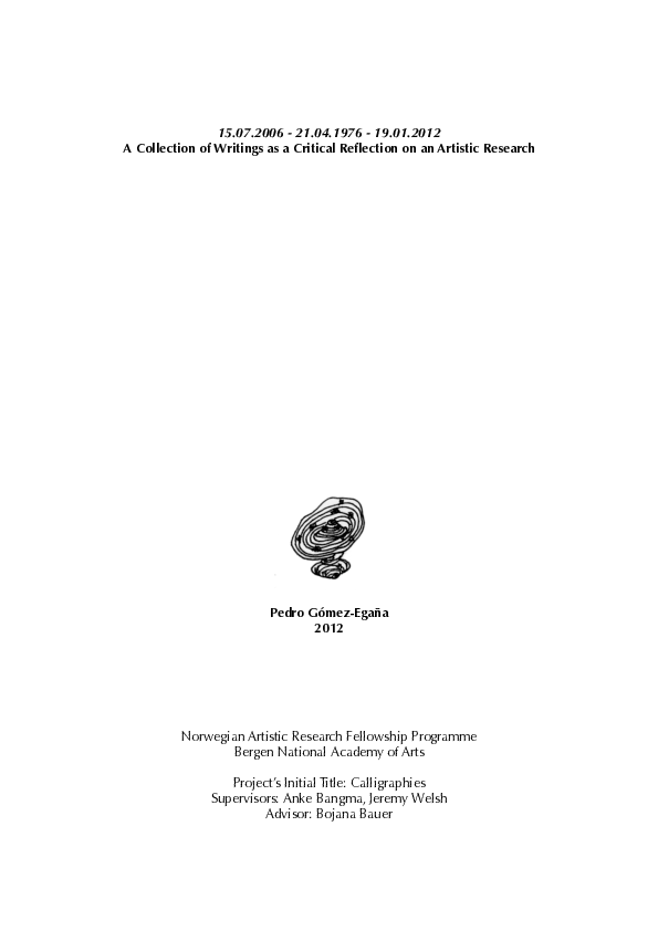 The collection of writings that I put forward here are a personal interpretation of what a critical reflection, in a practice-based artistic research project, can be. They represent an attempt to evidence the learning process that I have undergone during the last three years, in particular to illuminate the relationships between some of the terminology that I have encountered, and the artworks that have been associated with them. Since I have engaged with different reflective angles and different reflective strategies at different stages in the process, I have decided to submit a collection of texts, and one video, instead of a unified research paper. As is the case with many of my colleagues in this programme, I have found it challenging to navigate the tensions and doubts concerning the form, language and tone this critical reflection should use. There is always the risk of being too academic, or too anecdotic. There is also the risk of favouring an evaluation based on personal growth beyond the ambiguous, but no less significant, standards of the “art world.” As an artist without training in art history, art theory or philosophy, it can also be difficult to ensure that some of the more complex ideas are embedded with the rigour and historical awareness that their traditions demand.