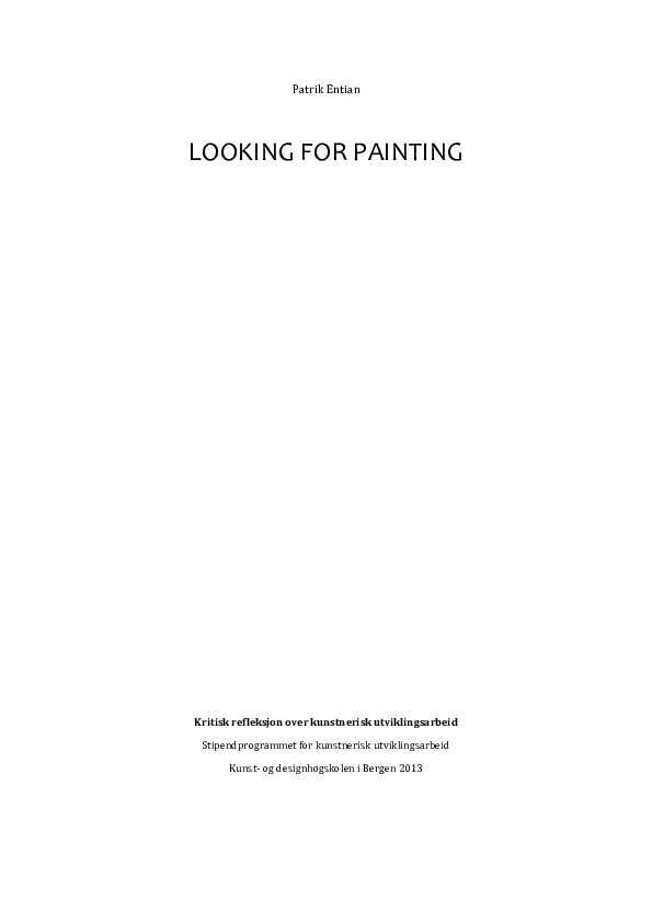Looking for Painting har varit ett projekt baserat på måleriet som praktik och den grundläggande metoden har varit att måla. Resultatet av projektet har också varit målningar. Insikterna och resultaten som jag uppnått kunde därför inte ha uppstått i en traditionell akademisk PhD. Projektet påbörjades i oktober 2007 och avslutades oktober 2011. Jag var sjuk under en period (2009) och projektet hade då ett uppehåll. Ett annat, kortare uppehåll uppstod när jag under fyra månader tog ledigt som stipendiat för att utföra en stor utsmyckning på Universitetet i Oslo.1 Den sammanlagda arbetstiden för projektet var tre år.