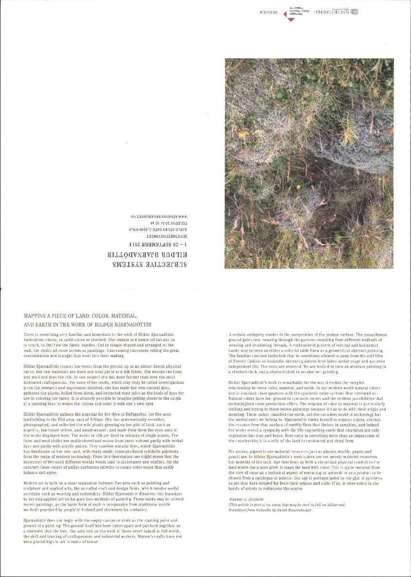 The project Textiles in the extended field of painting was conducted in the Department of Fine Arts of the Bergen Academy of Art and Design during the years 2012 - 2015. The research project has two overlapping aims: One is to explore the relationship between painting and textiles through weaving, while the other is to explore a plot of land in the south of Iceland, Þúfugarðar, which I recently acquired, using the plants that grow there to explore issues of belonging and ecological disruption. The project was supervised by Hilde Hauan, professor of textiles at Khib, and the artist Anne Katrine Dolven. The artistic outcome was presented in the solo exhibition colors of belonging at Bergen Kjøtt in November 2015. This text contextualizes and articulates the process and the outcome. Together the artistic work and the reflection constitute the formal result of my fellowship project within the Norwegian Artistic Research Fellowship Program.