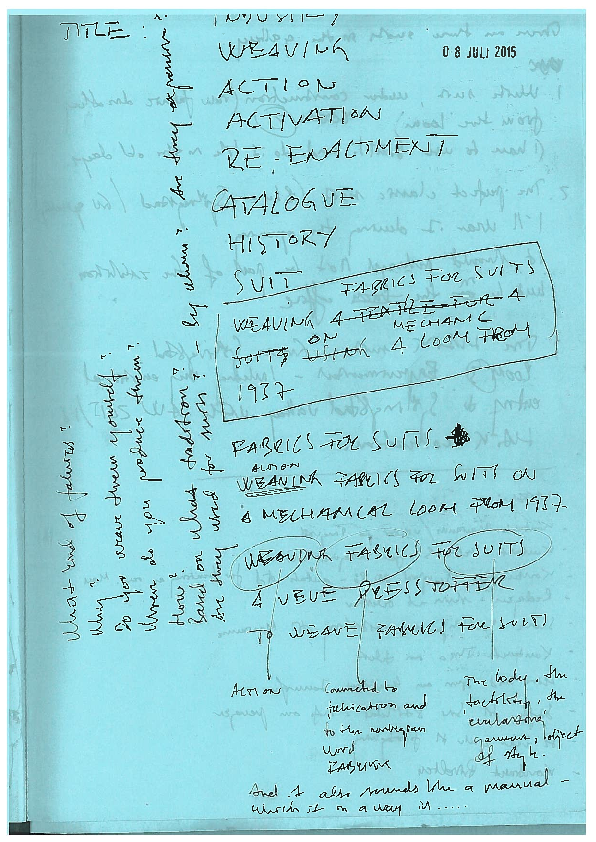 I began the Norwegian Artistic Research Fellowship Programme at the Oslo National Academy of the Arts (KHiO) in October 2011. My work, Weaving Fabrics for Suits, was developed in the textile department of the Art and Craft faculty. Gerd Tinglum was my first supervisor, and I had two second supervisors, Anne Knutsen and Theodor Barth. Jessica Hemmings was the text supervisor for this reflection. I spent three and a half years on the programme, with my final exhibition Weaving Fabrics for Suits showing at the Oslo Kunstforening (OK) from 13 March to 19 April 2015. The exhibition and an accompanying catalogue were the artistic outcomes presented for assessment in 2015. This reflection text is submitted for review in 2017 and 2018. The reflection is a series of shorter texts – fragments that, to a greater or lesser degree, relate to the context in which they stand. Sections of text in black make up the newly written reflection. Sections of text in green are edited and translated versions of the texts I wrote for the exhibition catalogue in 2015, with the exception of The Blue Suit, which is a new addition written in 2016. These form part of an experiment in poetic writing, and for that reason they have no references. The sections of text in italics are quotes. I choose not to use the term project about my work in the programme. My explorations have not been sufficiently planned or delimited, neither in time nor in content, for project to be a suitable term. My work is built on craftsmanship and my own biography. I use references and theory where they naturally form part of what is necessary to write about. This is not a text about the history of the Norwegian textile industry. It is not a text based on phenomenology, economy or queer studies. It’s a text about sensation, longing, belonging, memory, pride and being gay. I write about my work and about myself, based on my experience as a tailor, weaver and dyer – above all from the perspective of my practice, as a maker.