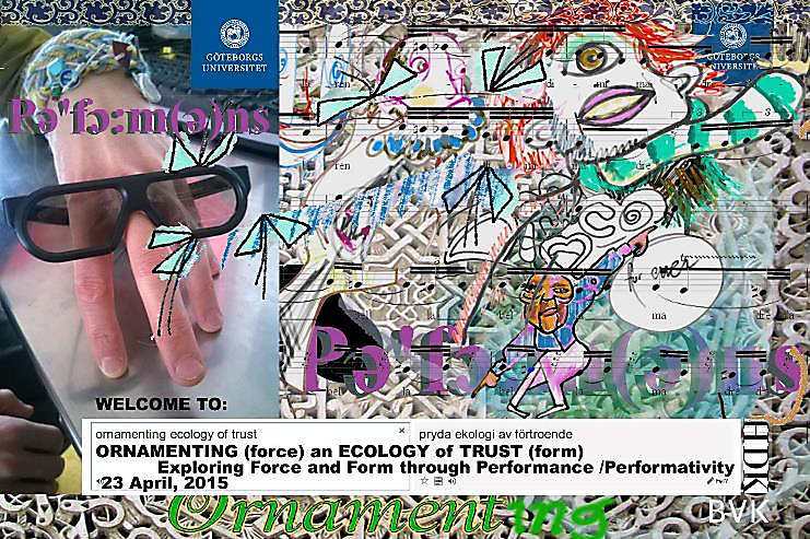 The Faculty Group for Performance /Performativity invites you (this is an open invitation!) to an entangled encounter. It is an invitation to enter an academic environment on equal terms, allowing for a broad and at the same time a deep investigation into processes of understanding and knowing. The purpose of this event is to magnifying the motion of force, by placing patterns and fragments of performative ‘doings’ under a microscope and intra-actively analyzing the results in relation to form, space, time, senses, voices, products of knowledge, learning/teaching, and every day practices. We believe there is a need for tracing patterns of forces between scholarly, artistic and scientific doings (forces/practices and forms/theories that at first might appear distant from one another) through a blurred, diffused and diffractioned encounter - in order to re-generate new knowledge. When defining our own ‘doings’ in society we can eventually continue to design solutions creating changes in our habits. In a long-term perspective these changes can transform into new ways of meeting nature, but also in meeting one another as members of a complex global community. The aim of this entangled encounter is to turn forces and forms of academic traditions slightly upside-down/inside-out, somehow mirroring ‘the uneasiness’ sensed around us in our global society. Our common task will be to create an environment where boundaries between subjects and objects at first remain undefined and uncertain in order to intra-actively articulating new knowledge while ORNAMENTING (force) an ECOLOGY of TRUST (form).
