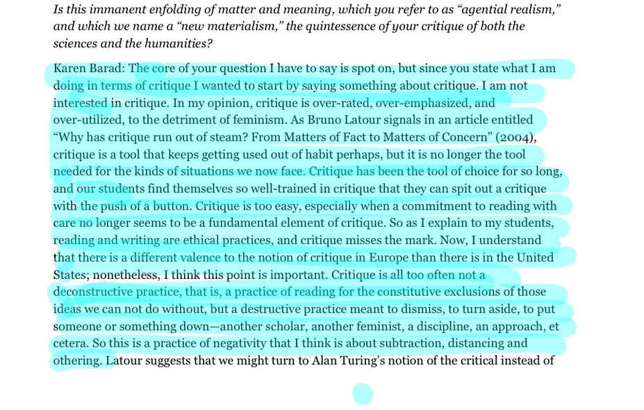 "Kunskapspraktiker och vardanden är inte isolerade från varandra, i stället är de invecklade i varandra. Vi får inte kunskap genom att stå utanför världen; vi vet eftersom 'vi' är i världen. "(Barad 2003; Svensk översättning finns i: Åsberg et al 2012, s. 85)