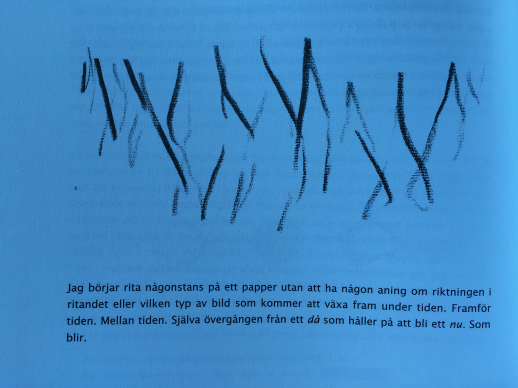 “Vägen till gestaltning handlar om att sätta hela kroppen i rörelse. Till en början uttrycks det skrivna endast under läsning. Släpper jag kontakten med pappret upphör det att uttryckas av mig. De två aktiviteterna, att läsa och tala, korsas och sammanförs på vägen. Läsningen är central. Där befinner jag mig länge, där tar gestaltningen form.” (Dahlen 2012 s. 99)