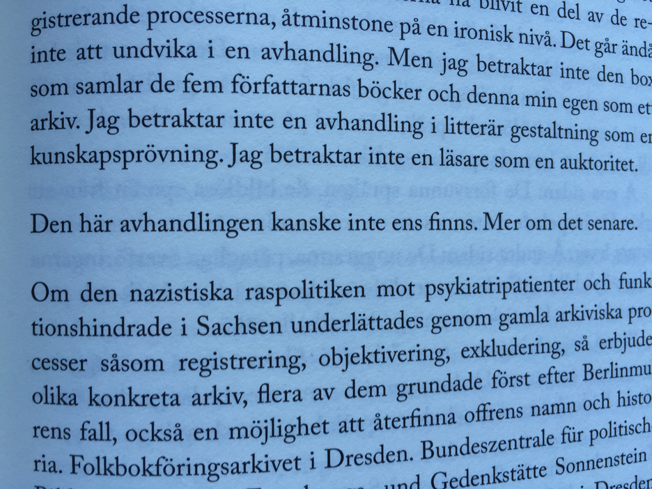Bara ett sinnligt närvarande, ett seende och ett lyssnande; ett varande som står långt ifrån det binära, det dualistiska jämförandet, det kritiskt fördömmande. Vad som infinner sig är ett onto-epistemologiskt närvarande som inte skyr varken trassel eller det möjligtvis omöjliga. Främst bland de analytiska redskapen i skåpet hos den icke-linjäre forskaren står det performativa. Ett redskap som uppmärksammar det som uppstår i det tidsliga rum som bara blir och blir ...