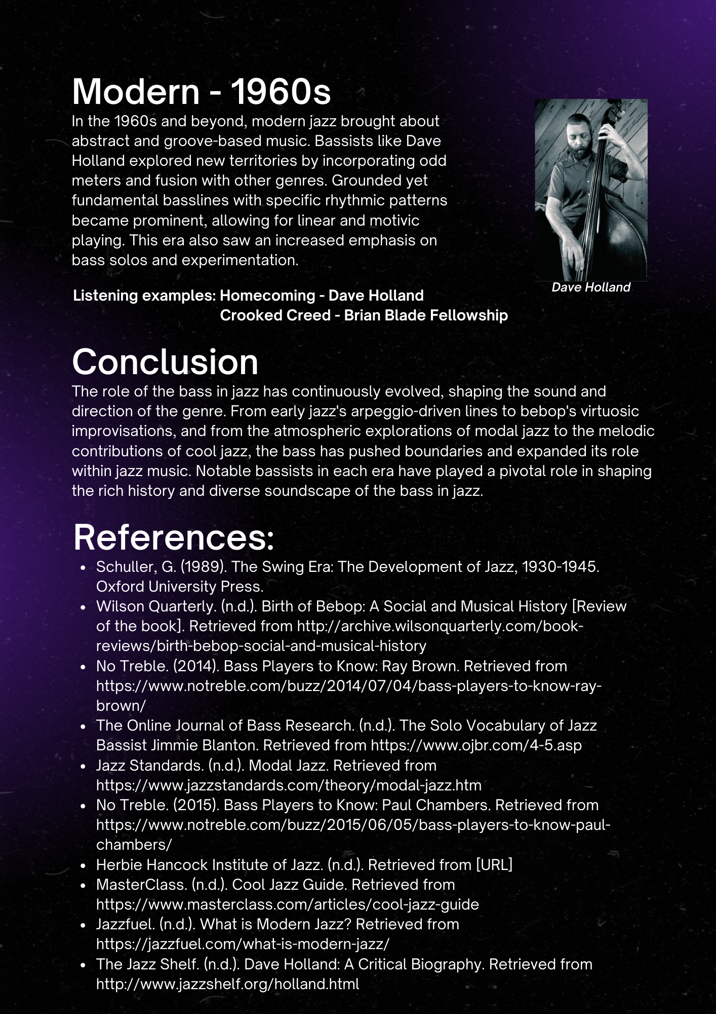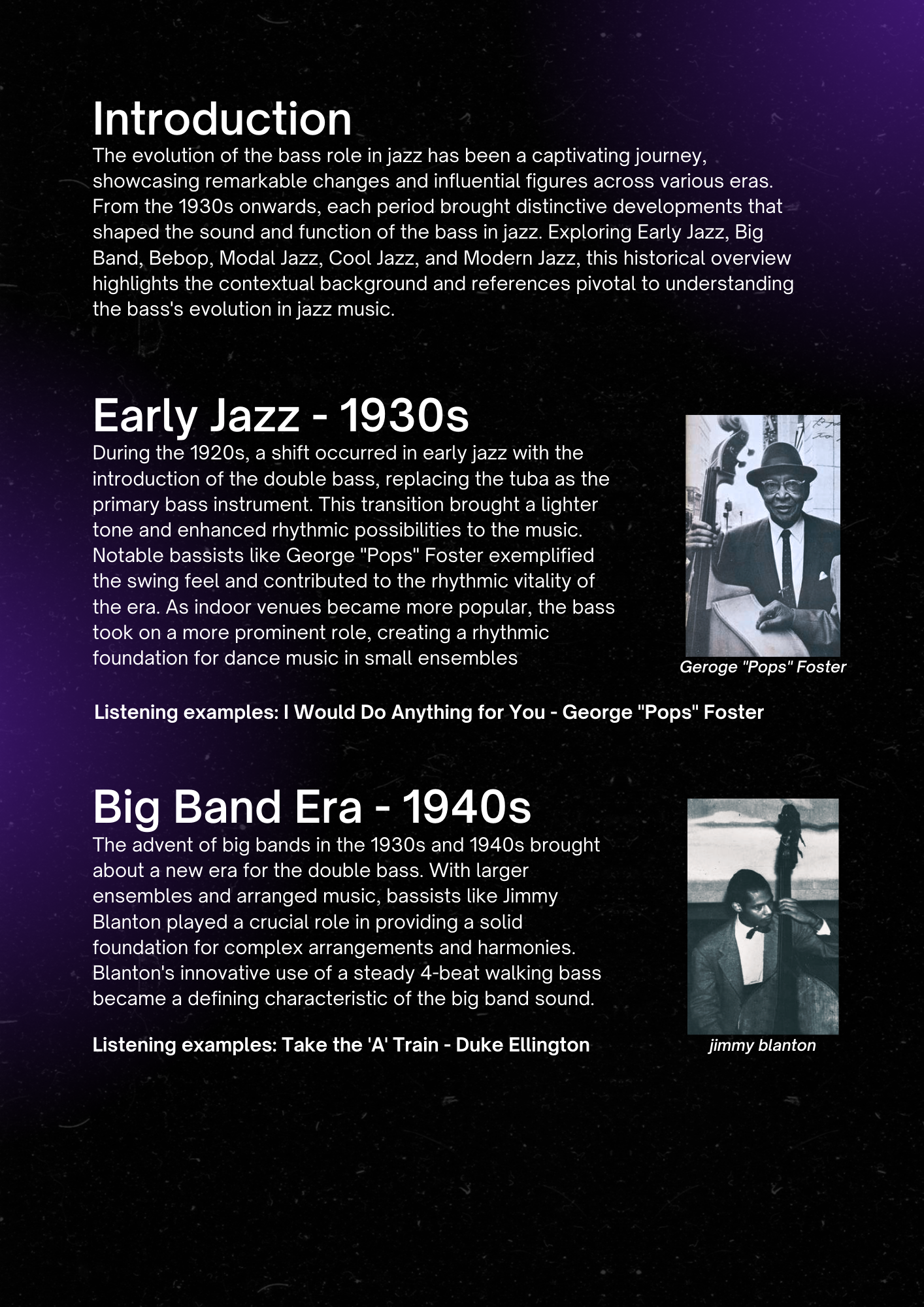 This overview traces the evolution of the bass in jazz music, highlighting its changing role from early jazz to modern jazz. It explores the importance of the bass in different setting, the virtuosic and improvisational style of bebop bassists, the atmospheric qualities of bass in modal jazz, the melodic contributions in cool jazz, and the exploration of abstract and groove-based music in modern jazz. By examining key figures and musical periods, we gain insights into the diverse and influential role of the bass in shaping jazz music.