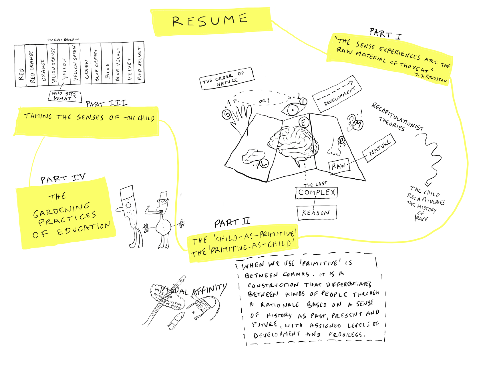 Cat Martins’ text Learning Through the Senses: Colonialities in the Making of the Western ‘White’ Child discusses children’s learning through the senses as part of the colonialities of arts education practices. Being possible through the split of body/mind and the approach to a certain notion of [[nature]], the child was constructed through processes of ‘Othering’. The text also tries to unpack this making of the ‘white’ child while exploring its colonialities in the [[gardening practices of education]].