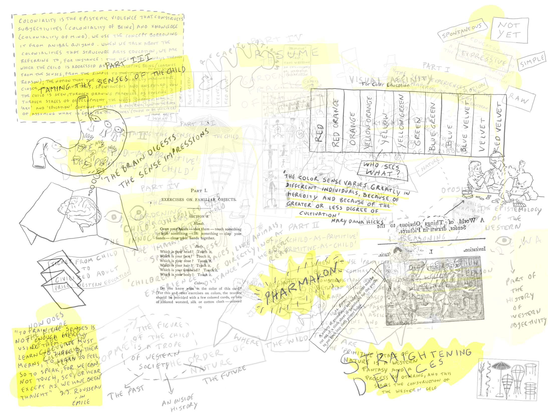 We also look at these exclusions in how we dealt with history. The ‘archive of the creative child’ that we ended up with, is made up of mostly male and ‘white’ voices. Our initial goal was to understand what was being said about the child and creativity that made it a concern for the child's government. However, throughout the project and the encounters with these voices, the subject positions emerged as a problem that we must consider in future research. As much as this archive delineates what was called a ‘knowledge’ about the child that imagines and creates, it also traces the limits of what is thinkable and can be said, through what is rendered out of our sight. There were many questions that we asked and were asked that we were not yet able to answer. This problem comes with the need to engage with arts education counter-narratives and stories of resistance.