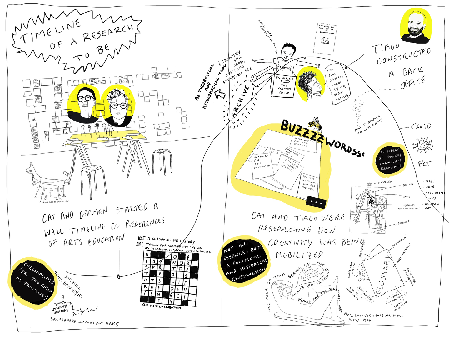 In 2019, before this project and as an antechamber of it, me and Carmen Mörsch initiated a preliminary intensive work, composing a wall timeline of international historical references of arts education discursivities. Although these references were not put together only with the ‘creative child’ in mind, they constituted the first steps of the archive we built at CREAT_ED. The archive is made of documents never meant to be recalled because of their ways of talking about imagination or the relationship between their authors. The documents are placed together, and form an archive through their grids of rationality, in making intelligible the idea of children’s power to imagine and create. The Foucaultian (1972) notion of the archive was mobilized as a theoretical and methodological tool that favored a vision of the archive as the understanding of the historical conditions in which statements are formed. The term archive was not used as the sum of texts that a certain culture decided to preserve, neither the totality of texts produced about a certain topic, nor all the texts produced by a specific author or institution in a particular place. But certainly, the archive is always in a dialogue with power.