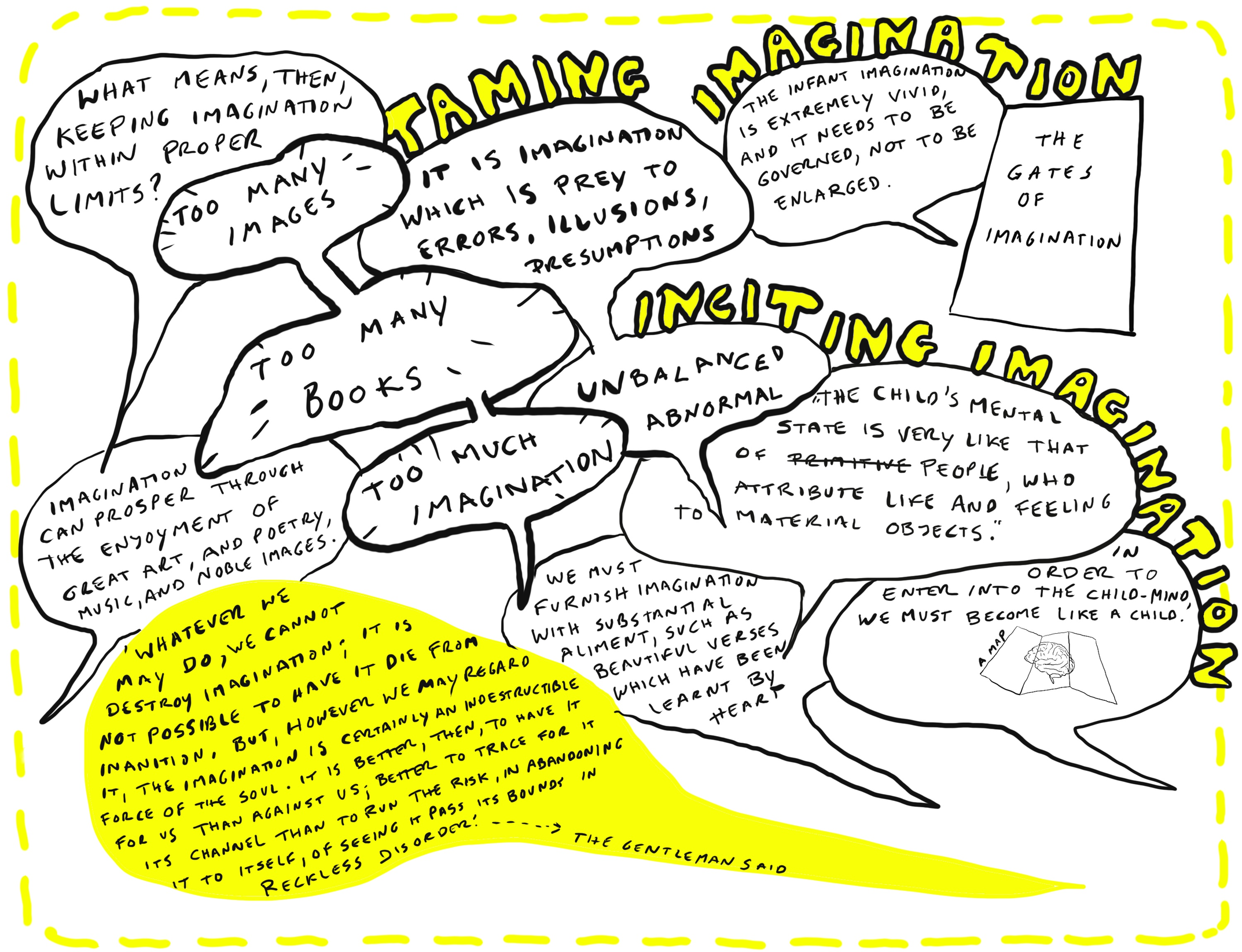Cat Martins’ text The Historical Ambiguities Surrounding Imagination: The Government Of The Hopes And Fears Of The Child’s Imaginative Mind argues that, historically, children’s power to imagine beyond reality was perceived as dangerous within the Western educational field, particularly echoing some earlier traces of imagination in connection to a female monstrosity and to madness and the need to construct borders between different types of imagination, defining the morals of how to imagine correctly, as a way of governing the creative child. Sometimes welcomed and desired, sometimes feared for the troubles it might cause to the production of the child as a citizen of the future; throughout the text it is possible to observe that the imaginative child praised in Western education was entangled with racial, gender, and ableist grids of thought.