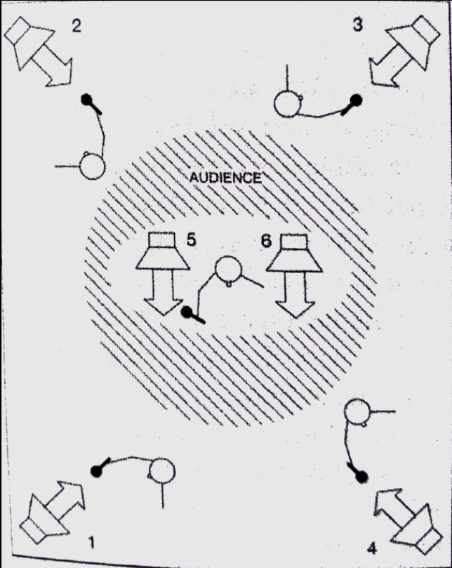 Like Mikrophonie I, the microphonic instrumentarium of Quintet also includes a mixing console. Quintet’s stage plot (fig. 3-4) depicts four microphonists surrounding the performance space with a fifth in the audience itself. This fifth performer “also operates other electronic equipment so as to alter the characteristics of the feedback sounds, in a ‘solo’ that happens around four-and-a-half minutes into the piece.”6 Part of this “other electronic equipment,” what I refer to as the mixing board, is a sine/square wave generator that is used in the following way: