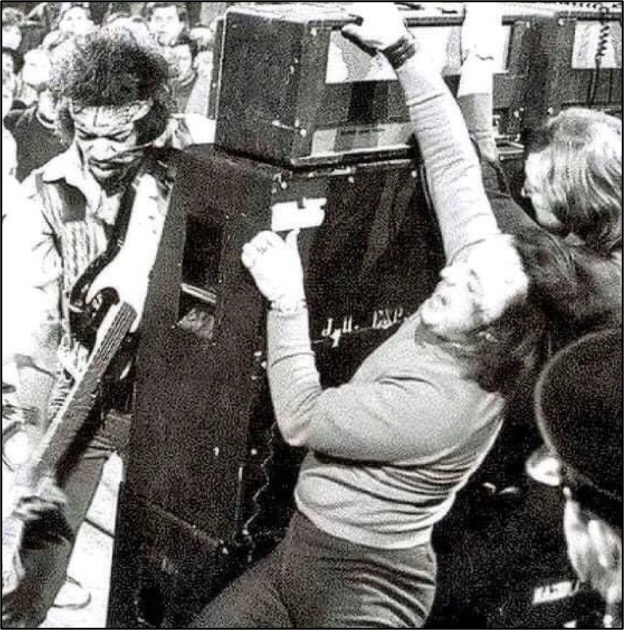 Hendrix on stage ramming his guitar into a Marshall Stack amplifier while stagehands attempt to keep it upright. Albert Hall, 1969.13