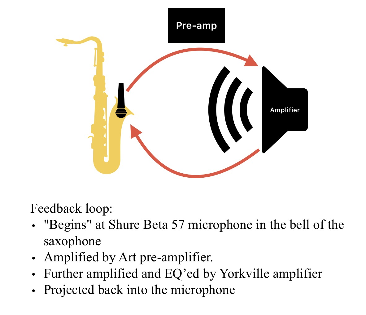 I discovered saxophone-controlled feedback in 2015, in my hometown of St. John’s, Newfoundland and Labrador, Canada when I was performing in an ad-hoc group at “Night Music,” a monthly free-improv jam hosted by the renowned Sound Symposium festival. I had positioned my saxophone close to a microphone and when I lifted the bell of my instrument to cover the microphone, a sine-wave-like feedback tone1 emerged from the stage monitor.2 Upon hearing this effect, I tried to recreate it and, by intent or chance, I moved a key and changed the pitch of the feedback tone. Despite this being a completely novel phenomenon to myself, the other musicians, and the audience, I was chastised by the sound technician3 – these sustained tones were not good for the equipment – so I treated this phenomenon as interesting but left it for a later time.