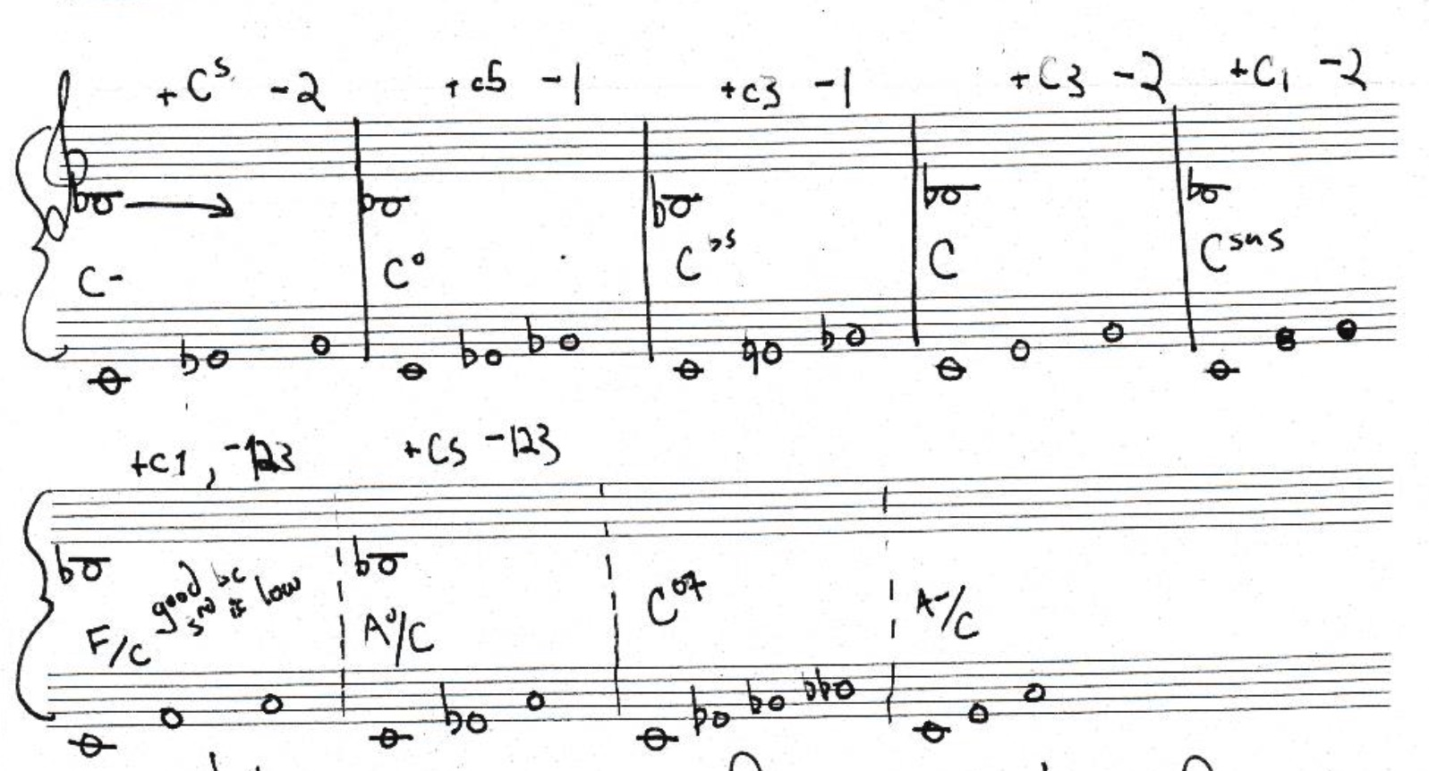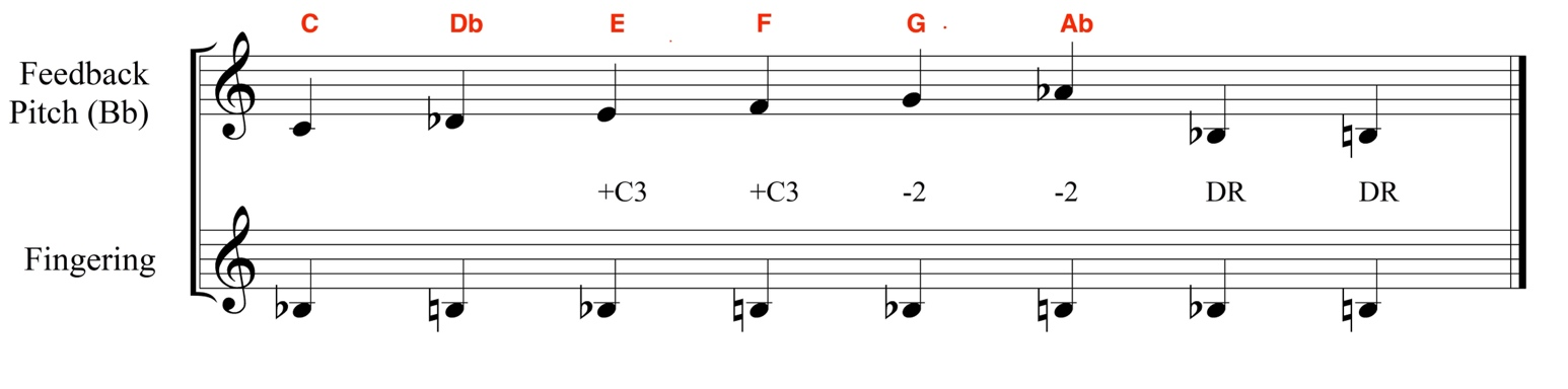 Figure 5-3 shows the pitches I chose for Stride, notated in a similar style but with the staves switched. The fundamental fingerings of B♭ and B in this collection produce feedback pitches a tone higher – C and D♭ – than what would be conventionally produced through blowing but maintain the same semitone relationship. This semitone relationship continues even as keys are similarly added or subtracted from each fundamental fingering. Two additional pitches are made by dampening the reed, notated as “DR,” achieved by pressing the tongue or lower lip against the reed to create a seal against the mouthpiece. These notes form a hexatonic scale that resembles the freygish or hijaz mode used in much Jewish and Arabic music, with the bottom two notes acting as approach notes to the lower tonic (C). Additionally, the C (C E G) and D♭ (D♭F A♭) major triads present in this scale are prominent figures in the piece.