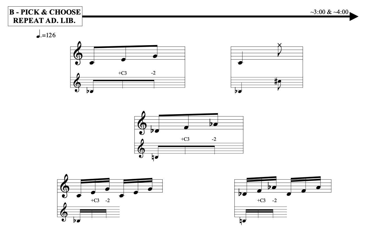 I recorded improvisations using the above material that I reviewed to note successes, new discoveries, and areas to improve. Through this process, I developed the melodic material, which I then organized into cells to ensure improvisation remained part of the interpretation process (fig. 5-4). To create a work that clearly demonstrated the basic functions of my feedback saxophone system, I limited the piece to the above notes and constrained its harmonic and formal complexity. It follows a simple three-part musical structure over five rehearsal letters, is pulse-driven, with rising triads in compound time as the primary source material.10