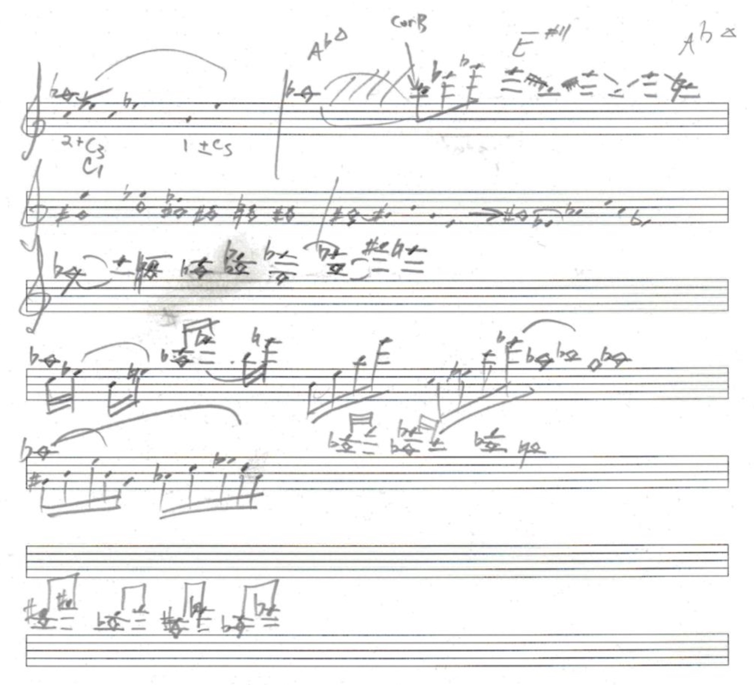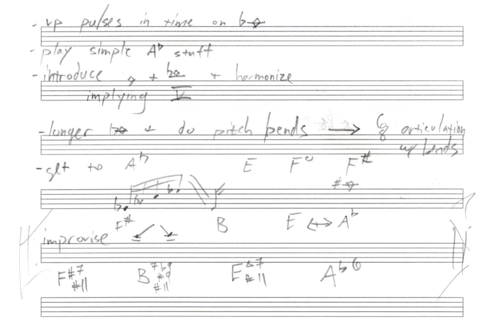 The new feedback notes in Doina no longer could be thought of or notated as being related to a fundamental pitch or fingering. I therefore devised a single-staff system in which feedback tones were represented by diamond noteheads, making the notation more in line with conventional contemporary saxophone scoring and easier to read. Figure 5-8 shows a sketch I had made for the form of Doina that I used like a “chord changes” jazz chart to improvise over. I recorded myself playing this form many times while noting how I could continue to shape the piece before recording it.