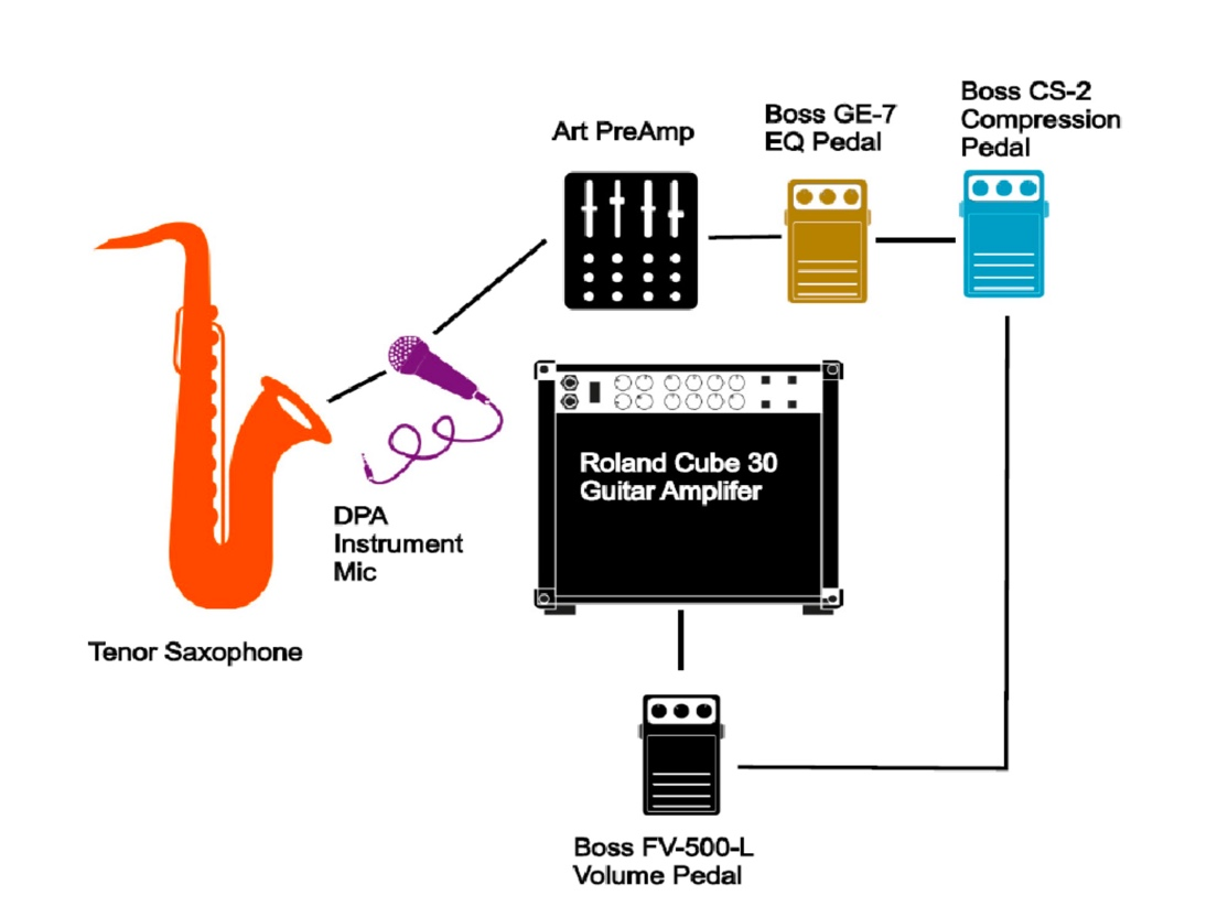 To address the limiting factors of the Beta 57, I began using a small “lapel” microphone, the DPA 4060,1 which facilitated the feedback notes I had discovered, was lighter and never scratched the saxophone, and did not encumber the regular playing of the instrument. To avoid feedback experiences that could be harmful to the ears, I added a Boss CS-3 compression pedal2 that amplified soft sounds while limiting loud ones. Not only did the compression pedal make this research safer for my audiences and I, but its tone knob enabled a wider variety of feedback notes. Similarly, I added a Boss FV-500L volume pedal3 that allowed me to quickly mute and dynamically shape the feedback tones, as seen and heard in the scores and recordings. Adding a Boss GE-7 equalization pedal4 enabled the tuning of specific feedback pitches. I also discovered that the much smaller Roland COSM Cube 305 amplifier worked with this updated instrumentarium while also providing a broader spectrum of timbres. Figure 5-6 depicts this new instrumentarium and its signal flow.