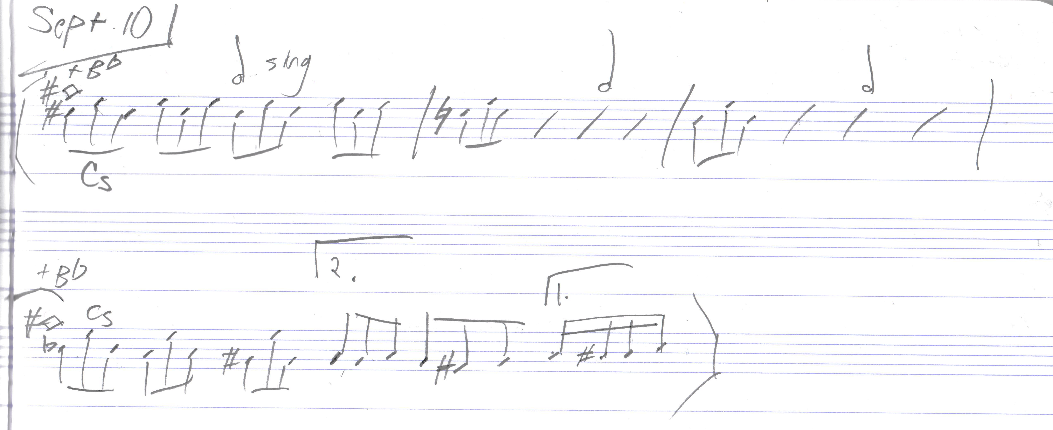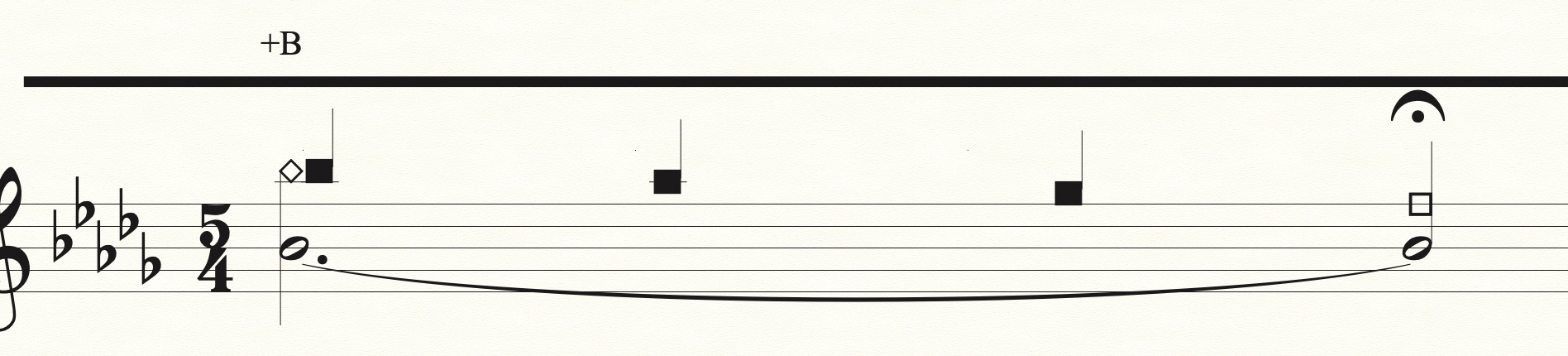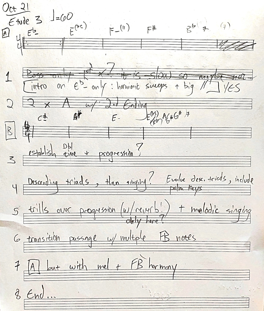 Figure 5-11 shows an early sketch of the form for Yen. Unlike Stride, with a set form of improvised cells, and Doina, a transcription with a form that emerged through its performance, the form of Yen was pre-conceived as ABA and then through-composed. The new element of the score, relative to the first two pieces, is the vocal notation. To include this third layer of music in the same staff as the rest of the material, the vocalizations are notated as square noteheads (fig. 5-12).