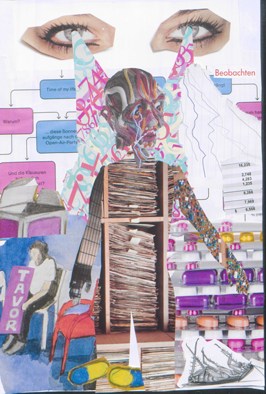 At first sight, the collage shows a silhouette of a person that is observed from a pair of eyes located above the. The dominant colors are pink, violett and blue, and the collage becomes more dense on the bottom. None of the pieces is ripped out and everything is cut into shapes that sometimes match the figure that is cut out or sometimes were cut to become a specific shape. Looking more closely, the two eyes are cut seperately and give the impression as if they were staring at the silhouette, because two triangular snippets of numbers are positioned at the pupils reaching to the silhouette. On the right we have a further snippet with scribbled lines pointing to the lower right corner of the collage. The corpus of the silhouette is made from a photograph of a pile of documents. The head is made from a head that is facing towards the viewer, although the silhouette is displayed from the back. The left arm (viewers perspective) is made from a photograph of a reflecting window and the right arm is made from a birds eye photograph with colorful shapes. In the background, there is a flow chart diagramm in the upper part and a staple of pills on the right side from the middle to the bottom. There are further pills in front of the right leg of the silhouette. On the lower left side of the collage, there is a person sitting on a chair in a blue room, that looks like a waiting room. That person is carying a large pink sign labeled “tavor”. On top of this element there is a pink box. In front of the staple of pills there is a black & white insect, possibly a bug, laying on its back. On top of the staple of pills there is a little table with numbers that could be from a bill. The collage does not work a lot with words, but one word that was cut out and positioned on the right side below the eyes is the german word for observing “beobachten”. From the flow chart one can read “time of my life” as well as the german word for why “warum”?