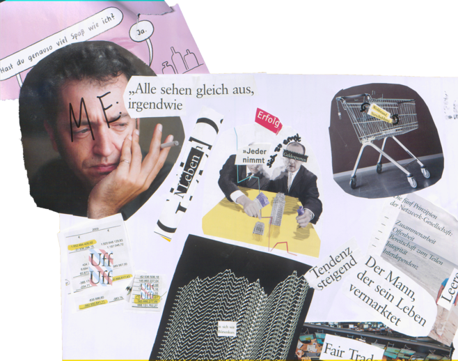 Description: There are five main visual elements in the collage and a lot of small text snippets. The most striking element is the photo portrait of a middle-aged person in the picture's upper left corner. It is also the element which overlaps the frame of the paper the most. The person has a worried look, rings under their eyes and rests their head on their hand in which they hold a cigarette. Their gaze is directed towards the rest of the collage on which the other elements are arranged in a tilted manner. On the portrait, there is "ME:" written on the forehead of the man and a cut-out writing is pasted next to it, parallel to the edge of the paper frame: saying “ "Everyone looks the same somehow. ” Behind the head of the portrayed person, there is a small comic dialogue pasted completely out of the frame of the collage. There are two speech bubbles visible, seemingly coming out of the head of the person: “Are you having as much fun as I am?” - “Yes.” The other main visual elements are also all complemented with some text snippes pasted onto them. Sometimes also handwritten text is added. The only text element not directly linked to another element is the word “life” pasted nearly vertically between the portrait of the person and the rest of the collage. The center of the collage is dominated by a photo- montage where two persons, wearing suits are sitting at a yellow table dealing with money and some more abstract representations of the stock market. You cannot see their eyes as there is text pasted onto the faces: “ “Everyone takes” with a hand written addition: “themselves to seriously” and “Money experts” on the other persons head. Beneath that white on black background there is a square cut image of some kind of graphs that could represent stock prices, also tilted in a similar angle as the table above. At the top right corner there is the heading “Upward trend” pasted in extension of the graphs. In the top right corner there is a shopping trolley cut out in a round shape, with “prosperity” and “dept” pasted very small onto the middle and some hand written arrows connecting them in both directions.The last rather decent visual elements are two different sizied parts of a bill pasted next to each other beneath the portrait on the left side of the collage. On each of them there is pasted the expression “oof oof” in different sizes in the middle. Placed the on the bottom left there is photo of a lot of computer- screens probably from a stock market context on which is inserted the heading “Fair Trade”. And lastly there is a list of “the five principles of the network society” at the right edge of the collage, with a photo of a person turned towards the see in the background. Pasted onto the male read person is in rather big square cut letters “emptiness” and underneath the list there is the phrase “The man who markets his life” in big letter cut out in a round shape.