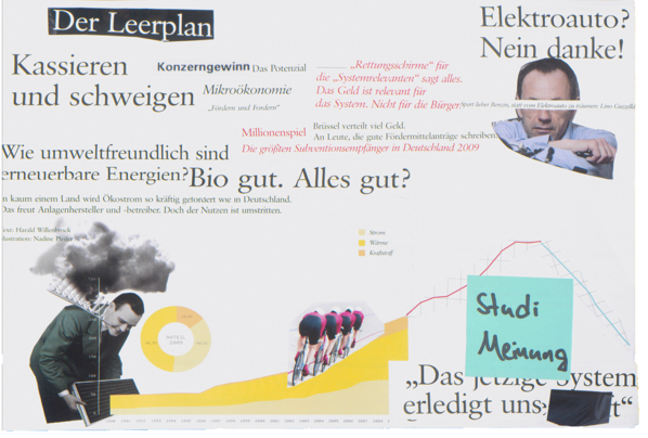 Black and white dominate the collage through the use of text. Colors from the color wheel stand out in used illustrations and make them appear in contrast to the used text (e.g. yellow in the graphic, pink in the bikers, blue in the shirt of the man). The collage works in a horizontal manner. Because text is used, the collage is read form and seen left to right – this, in fact, creates the line in the first place. This effect is strengthened through the use of the graphic in the lower part of the collage, where a line leads towards the right lower corner of the collage. This also makes the “landscape” created in the collage appear to reach beyond the borders of the paper. The whole collage appears to have two layers – the paper itself and the paper glued on it. In most instances, the cut outs stand for themselves and don’t overlap. Multiple layer can be seen in the cyclists, that drive on the graphic or the man in the upper corner, that has text glued over his eyes. In the lower right corner, a black element was glued over a quotation, covering the last word of the sentence. The collage is dominated by geometric shapes and forms. The words and sentences are cut in squares. The graph and the circle are geometrical as well. Everything is cut, nothing is ripped. This gives the whole collage a certain sense of order. Although there are many elements on the collage, there is much negative space as well. Through that, white is the most dominant (non)-color in the collage. A sense of three-dimensional space is created through the cyclists, that seem to cycle towards and beyond the borders of the collage. Although the objects are placed in a denser manner in the lower body of the collage, is still appears to be symmetrical balance. The space of the collage is used relatively equal in all its corners: For example, the whole horizontal line is used. There is a comparably blank space in middle of the collage, against which the order of the rest of the elements is created. Movement is created through the elements in the lower part of the collage. While the upper part appears still and is dominated by text, we see movement in the man holding the solar panel as well as in the cyclists. Because the words and sentences dominate the collage (and with it the color black and white) attentions is drawn the humanely subjects of the collage; thus the man with the solar panel, the cyclists as well as the man with the blocked view. Unity is created to the repetitive use of words (“öko”; “elektro”). Additionally, are patter is created within the horizontal movement of the collage.