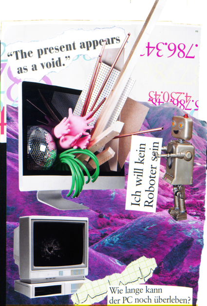 This collage consists of many smaller components set against a magenta pink/turquoise mountainous landscape. The dominant colours are purple, pink, turquoise and silver. Relatively striking is a neatly cut out IMac with various objects sticking out of its screen. The IMac is on the left and the objects are a disco ball, a few green cut-off cables, copper pipes and wooden strips. Furthermore, there is a perforated strip and a small sculpture made of 4 pink hands. To the right of the IMac is a silver retro-looking robot holding a sign that is tilted downwards with the inscription "I don't want to be a robot". The robot itself is smiling and looks friendly, like something out of a children's movie. At the bottom left of the picture and below the IMac is an old tube TV with a cracked screen. Both the robot, the sign and the TV are cut out precisely and cleanly. In front of the TV is a crudely torn image of an ECG heartbeat, which is tilted slightly upwards to the right. In front of it, again neatly cut out, is a snippet with the words "How long can the PC survive?". At about 2/3 height of the picture, the pink, purple, blue mountain landscape ends and the "sky" comes in. This shows relatively much free space and is only adorned by a few long comma numbers in pink/blue writing. Another roughly orn out snippet is located at the top left of this section and contains the following quote: "The present appears as a void.” Overall, the collage is characterised by the colour scheme, but also by objects and their relationship to each other.