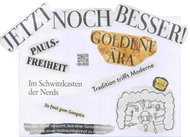 The elements beneath are (from top to bottom) “Pauls-Freiheit” - Pauls-Freedom, “Goldene Ära” - golden age, “Im Schwitzkasten der Nerds” - in the nerds’ sweatbox, “Tradition trifft Moderne” - Tradition meets modernity, “zu faul zum Googeln” - too lazy to google and “Wie Elon Musk versucht, aus einer Seniorensiedlung in Texas einen Weltraumbahnhof zu machen.” -How Elon Musk is trying to turn a retirement community in Texas into a spaceport. The text elements are mostly glued in tilted but beneath each other. In that way the image can be almost split up in two separate columns with a title on top. The only visual element is a cartoon in the bottom right which shows a character with frightened face. Around him are hands which come out a cloud each holding different tools or objects: a syringe, a microphone, a bottle, a wrench, a smartphone… Similarily in a Comic-Bubble style is a brief sentence glued on top of the cartoon: “…dies würde zu einem Absturz führen” - …this would lead to a crash.