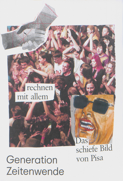 The collage appears with a striking simplicity. There are six separate elements identifiable. Three images and three text elements. The biggest part of the picture and most background element is a rectangular cut image of white teenagers in a crowd setting. Some are raising their hands above their heads clapping. Others are shouting or are looking upon a stage, which is not part of the picture. The image is subtitled with a big two word phrase: “Generation Zeitenwende” - generation turning point. The two remaining text elements are smaller. One is put on top of the dancing crowd: “rechnen mit allem” - reckon with everything and the other “Das schiefe Bild von Pisa” - The skewed image of Pisa is put beneath a watercolor image of a wrinkled face with big black sunglasses. The last visual element is a drawing of two shaking hands in the upper left part of the image.