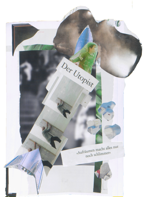 The Collage presents the viewer with a clear structure and lines. Main Element of the Collage is the assemblage of small pieces into the shape of a rocket, whose tip is tilted toward the upper right corner like it is about to leave the frame. The engine and the tip of the rocket appear as their original shapes and frame the body of the rocket. The body is filled however with three sequential pictures picturing a human body which is pushing something forward. What exactly remains unclear. Following the image sequence, which makes up the biggest part of the body, appears some lettering almost like the name of the rocket: “Der Utopist” - the utopian. The tip of the rocket appears not to be attached completely anymore but opens like a hatch and reveals the passenger: a young male-read human with its eyes closed and a green transparent silk scarf upon its face. It is unclear whether the lettering below them belongs to the rocket or whether the young person is “the utopian”. The background of the collage are many clearly separated fragments which origins or original meaning are unclear. In the upper left and lower left corner are fragments of what appears to be a black picture frame or book cover and behind the rocket is a square cut blurred black and white picture ripped from a page and still showing the white frame that originally surrounded it. Behind the tip of the rocket is a picture of white clouds infront of a black background. Like fog which is light with bright lights at night. The fog also leaves the frame of the DIN A4 page. Its the only object which leaves the frame intensively. Furthermore in the background appears a thinly cut out in straight lines and a right angle a green picture where fingers are identifiable. Important to mention is a second text on the picture which appears like the second focal point after the rocket. It is a sentence in quotation marks “Aufräumen macht alles nur noch schlimmer” - Cleaning up just makes things worse.