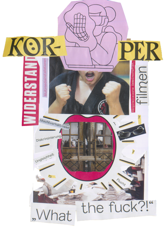 In the other collages there also appear some very first-hand connections to the respective courses of study. E.g., the two collages that display stock charts (RD1, NA53) come from the economics and business administration. They are also the only ones which explicitly mention and display money. RD1 mentions words around the topic of money six times. The two artists which come from the computer sciences (MR12, SD34) are also the only ones which display or mention digital technologies. The two cultural sciences artists (AK20, BR8) also show first-hand relations two their fields of study. AK20 displays two contemplating figures sitting at their desks, one holding a pen, the other listening to music. BR8 embeds cut out keywords like “power dynamics, discrimination, inequality, migration, resistance”. All of which I would consider as being dealt with a lot in the cultural sciences. But besides these at times obvious relations to the courses of study I find it most interesting to think about why the artists chose exactly these images and words. Do these collages offer access to the emotions towards their studies? SA30, KT1 and BR8 offer very evocative imagery that goes beyond shallow connections toward their fields of study. In SA30 the subject attempts to leave the frame. The figure at the top of the rocket is looking towards the sky whilst having a translucent scarf among its face. The background remains out of focus and clustered. Where is the subject heading to? This could express the artist’s reflection about the need to move forward, to break out and display a certain unease with the present, given the background and the shattered frame around the edges. Likewise, in BR8, resistance and unease seem to be among the dominant themes. The need to shout out and fight back but being heavily restricted. The shape of a screaming mouth in the middle of the collage which is closed with a locked and barricaded door. The anger and urge to resist is summarized with the big subtitle “What the fuck?!”. Both SA30 and BR8 inherit a lot of movement and dynamics. BR8 is being held back by something (the society?) and attempts to resist and fight for all the topics that attempt to leave the shouting mouth. SA30 is also attempting to move forward, and the frame is already shattered and fog leaves the frame. But where the flight is heading, we do not know. Dissimilar to the SA30 and BR8 the figure in KT1 does not feel empowered and ready to act. One large pair of eyes hover behind the figure. And like TJ Eckleburgs eyes in The Great Gatsby, they see through the figure making its head and body translucent and fragile. Stacks of pills and decision-making charts prove that the translucent figure is not in control of itself but in fact in a reciprocal and interdependent relationship with factors from the outside. This could reflect the views of the artists gained through their course of study as well as the figuration within their studies, or both.