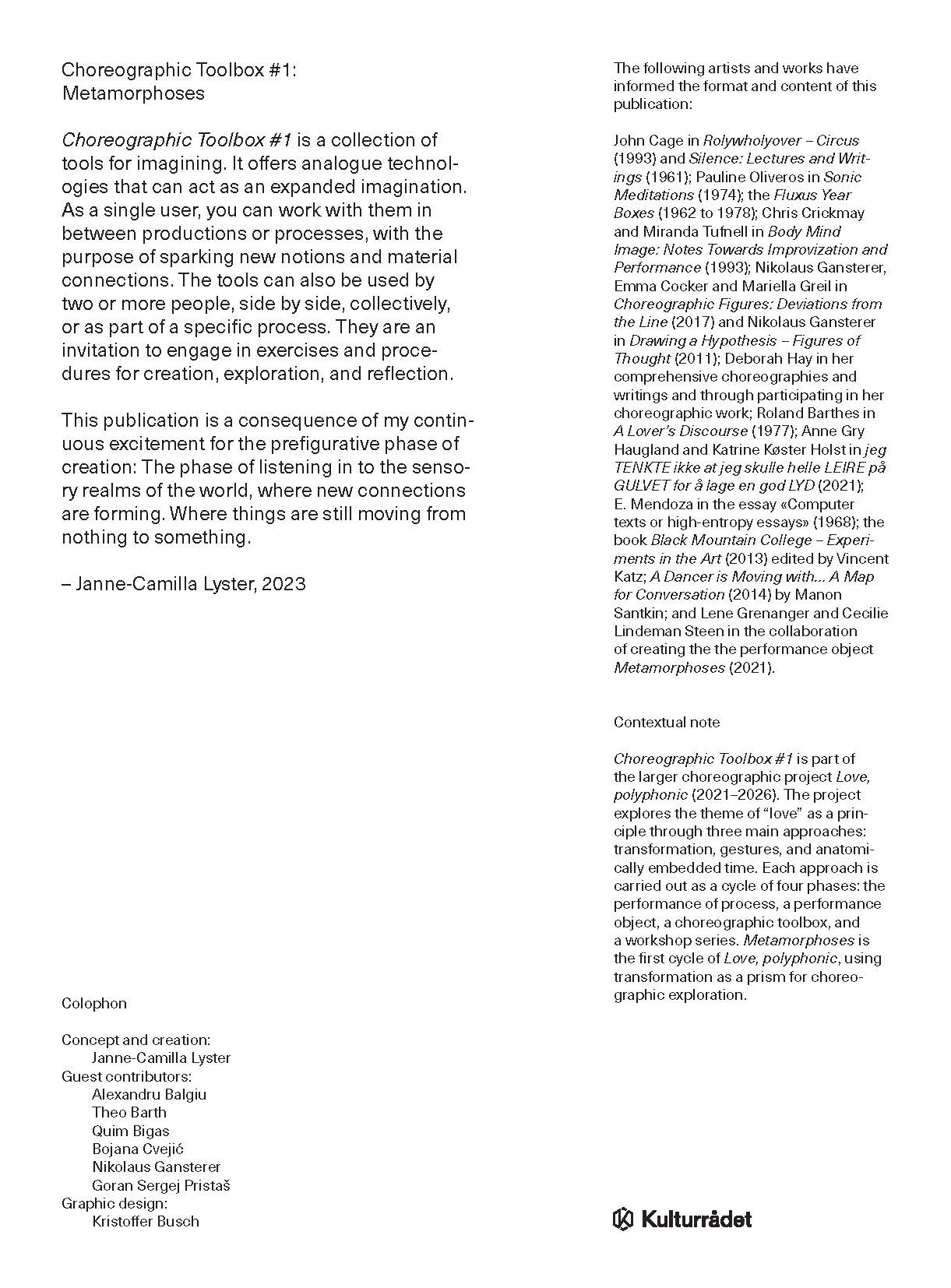 Choreographic Toolbox #1: Metamorphoses is a collection of tools for imagining. It offers analogue technologies that can act as an expanded imagination. As a single user, you can work with them in between productions or processes, with the purpose of sparking new notions and material connections. The tools can also be used by two or more people, side by side, collectively, or as part of a specific process. They are an invitation to engage in exercises and procedures for creation, exploration, and reflection. This publication is a consequence of the author’s continuous excitement for the prefigurative phase of creation: where things are moving from nothing to something.