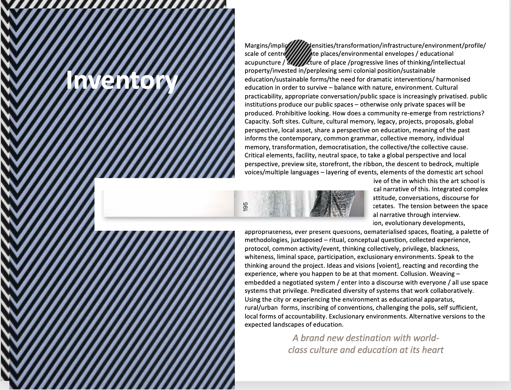 Inventory is the landing page of the Research Catalogue exposition, forming one component of my PhD submission. It contains six sections, each with a title indicating the content beyond. The application of rectangular boxes as bounded inventory containers of the research components is deliberate, emphasising the difficulty that alternative art education has in escaping formats that are standardised, established and institutional. You will find areas within this research exposition that contain historical and archival references and others that disclose the spatial and participatory conceptual frameworks and the interventions of three protagonist roles. There are also concepts and visuals that the viewer/reader may stumble upon, an outline of which may be found elsewhere in the exposition. These interventions again encourage the reader to engage and locate moments in a non-sequential encounter.
