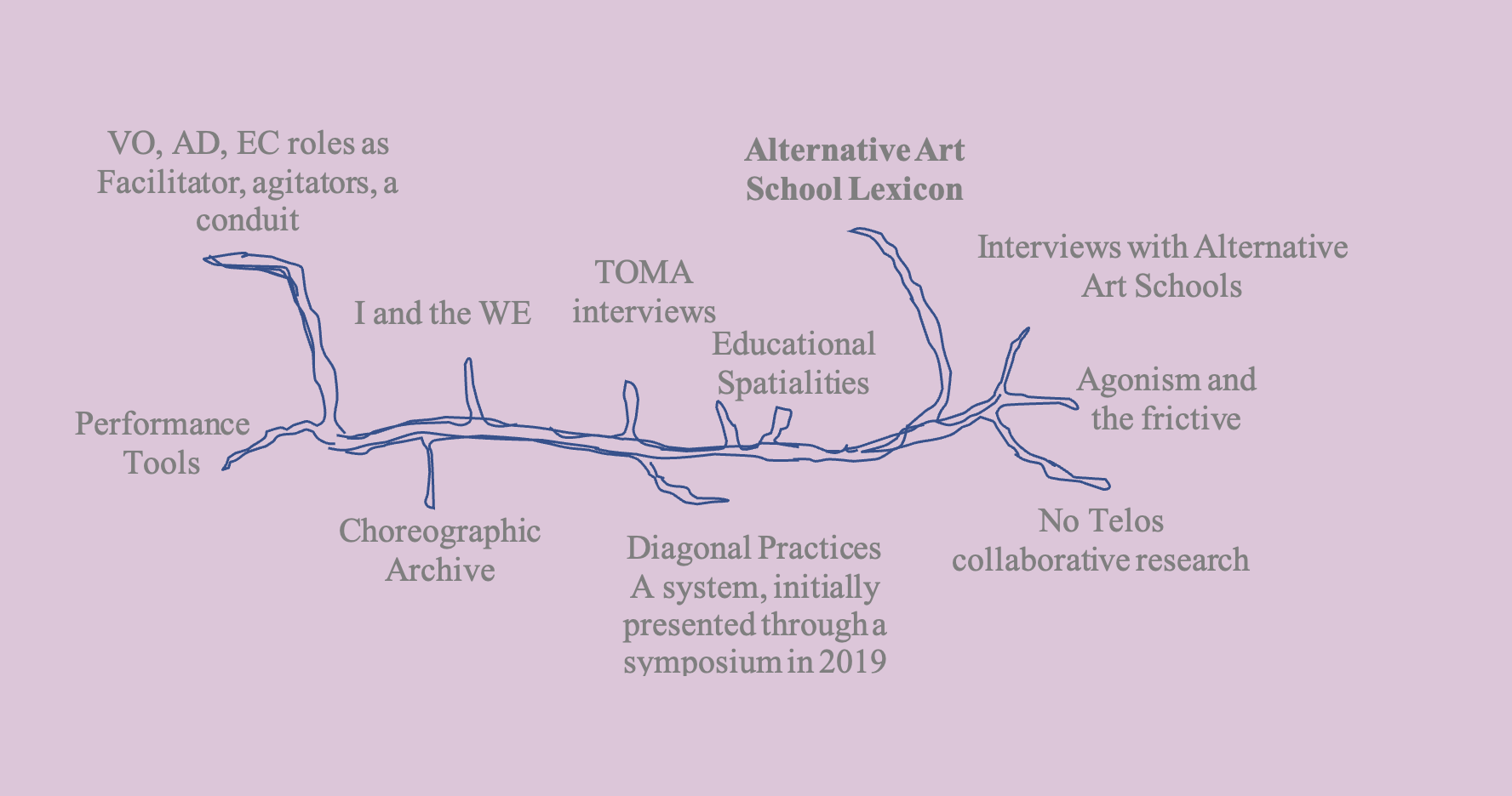 Chapter 1 Mapping: includes a defining section examining the patterns of ‘alternative/art/school’ through interventions into Anton Vidokle's ‘An Incomplete Chronology of Experimental Art Schools’, together with a mapping of alternative art pedagogies, in essence locating the alternative/art/school.