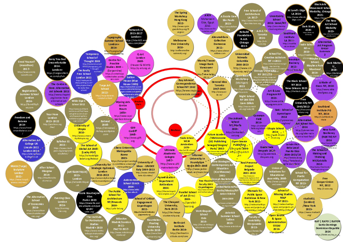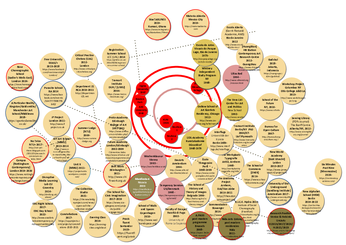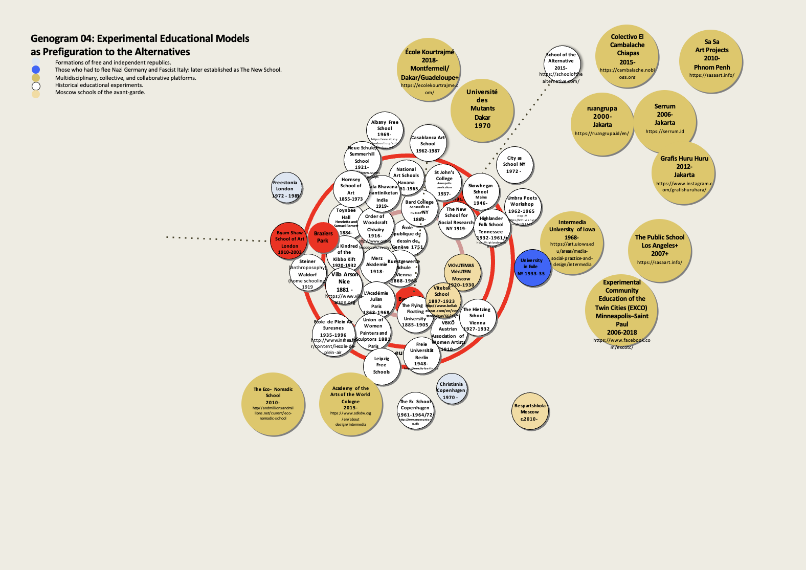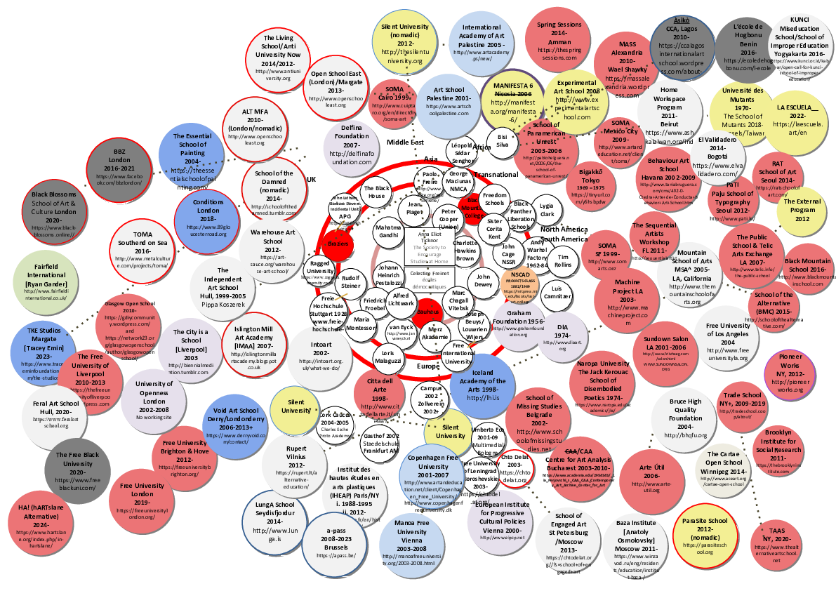 Extending Anton Vidokle's chronology through a deep mapping of historical and recent models of alternative art education and experimental pedagogies.