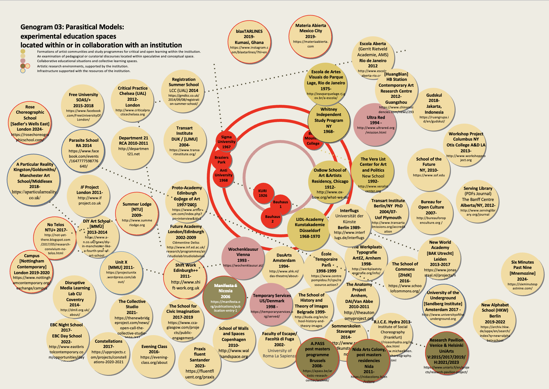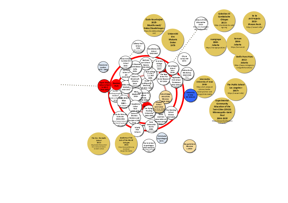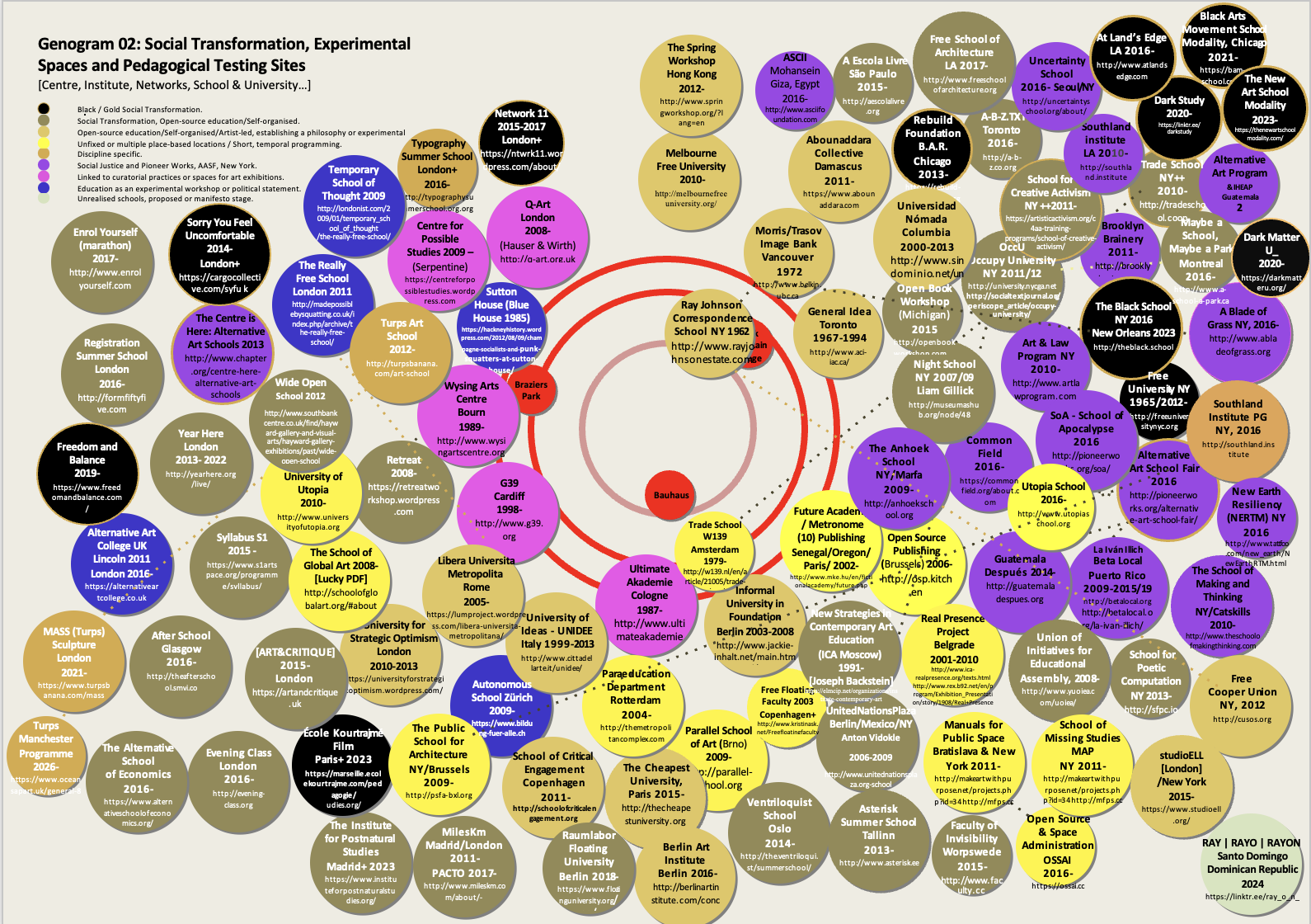 Extending Anton Vidokle's chronology through a deep mapping of historical and recent models of alternative art education and experimental pedagogies.