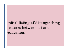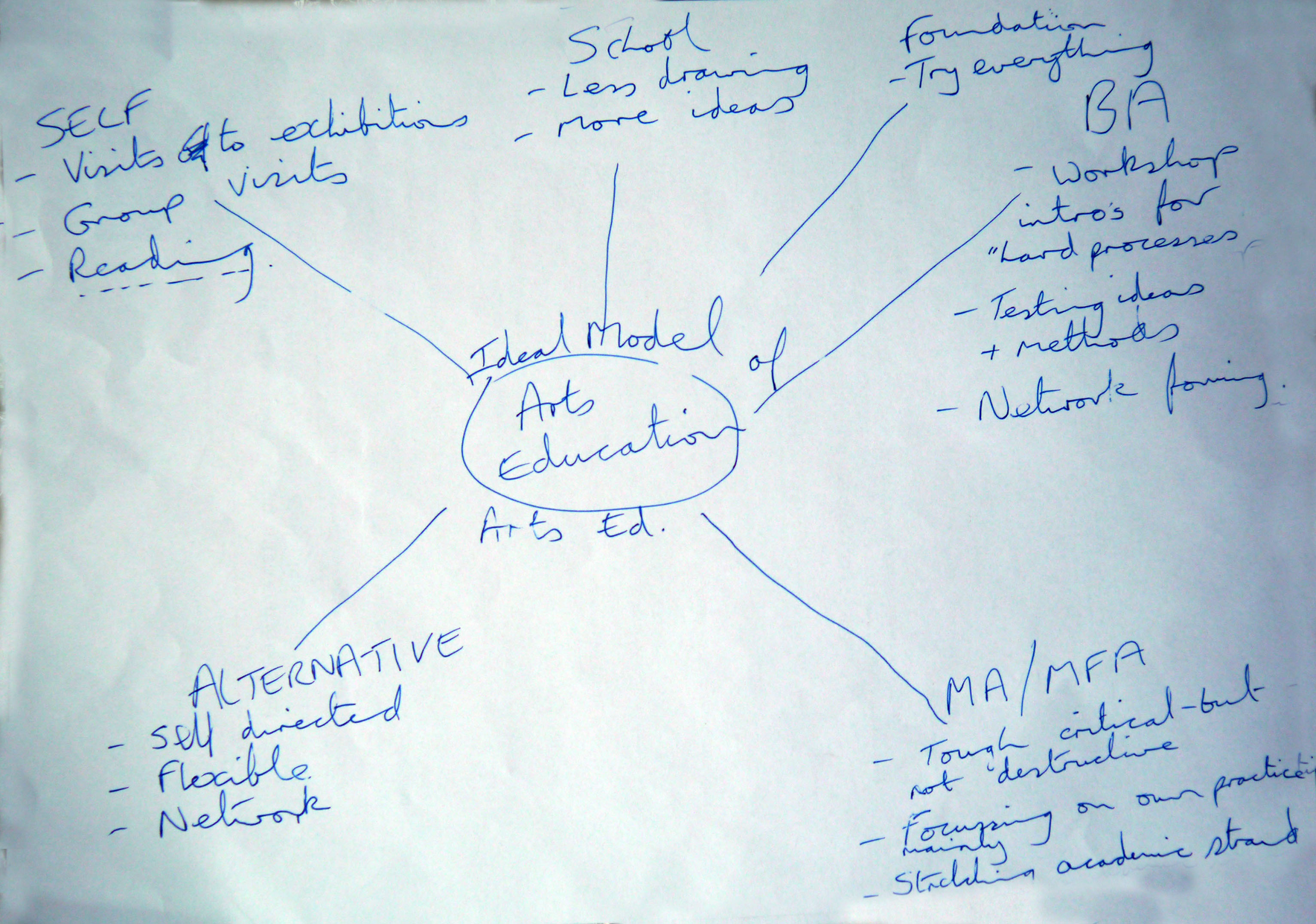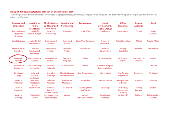 In selecting the sheet of red text, the reader can observe there are headings which have grouped similar terms, relationships or a central theme. These groupings or ‘pools of meaning’ establish some of the conditions of the alternative art schools.