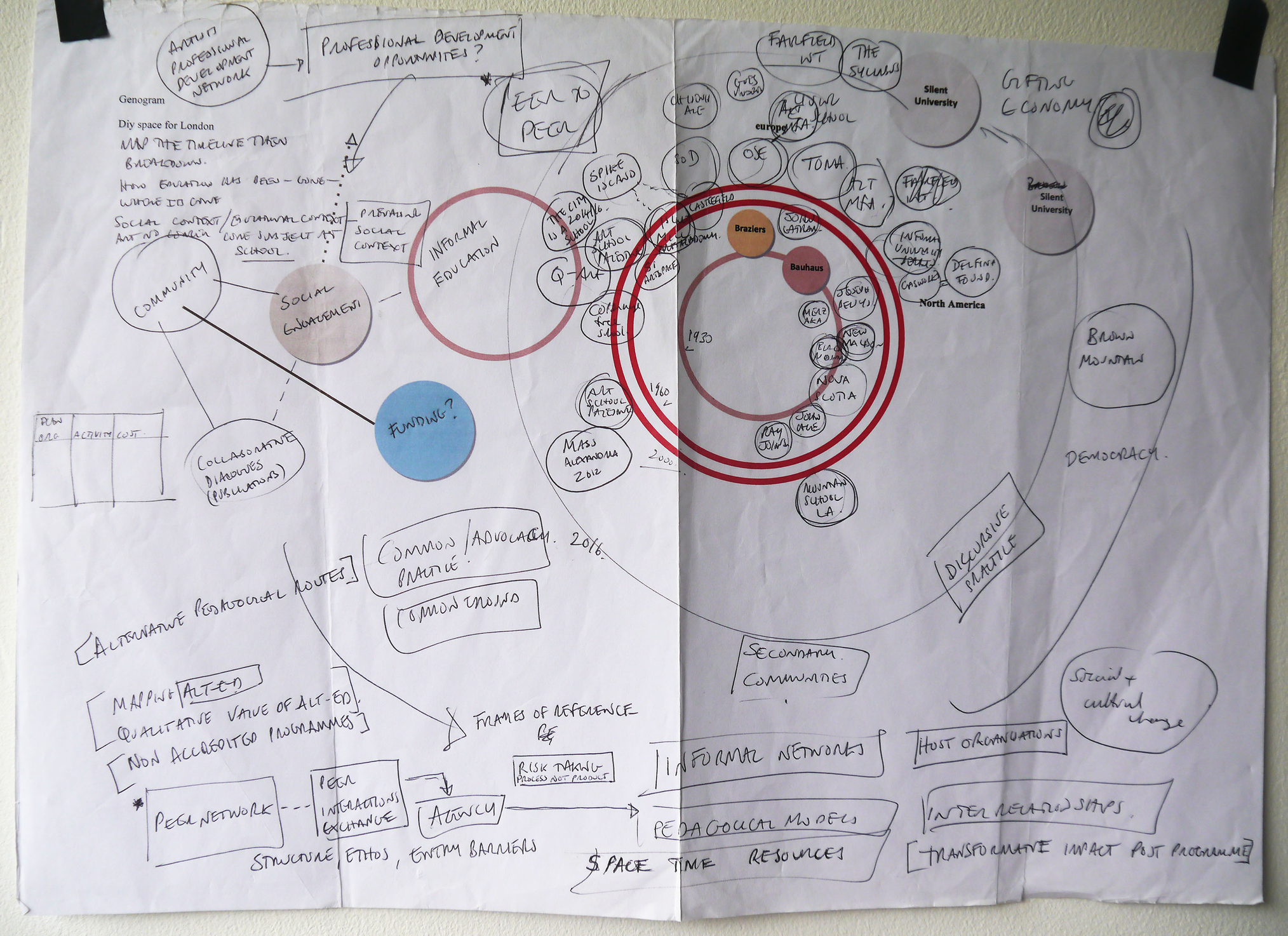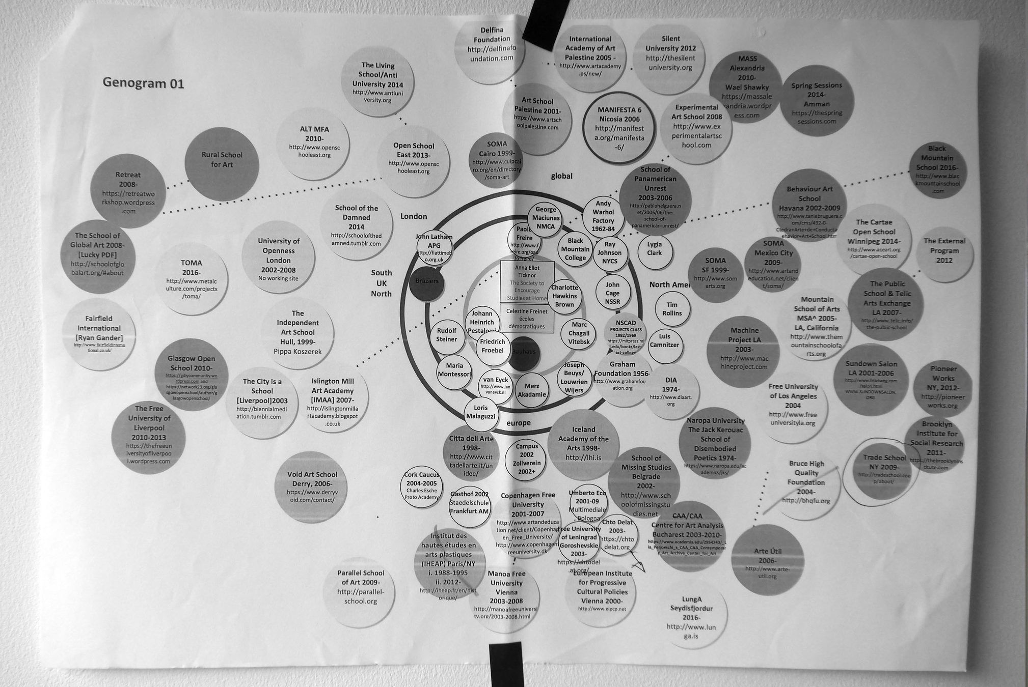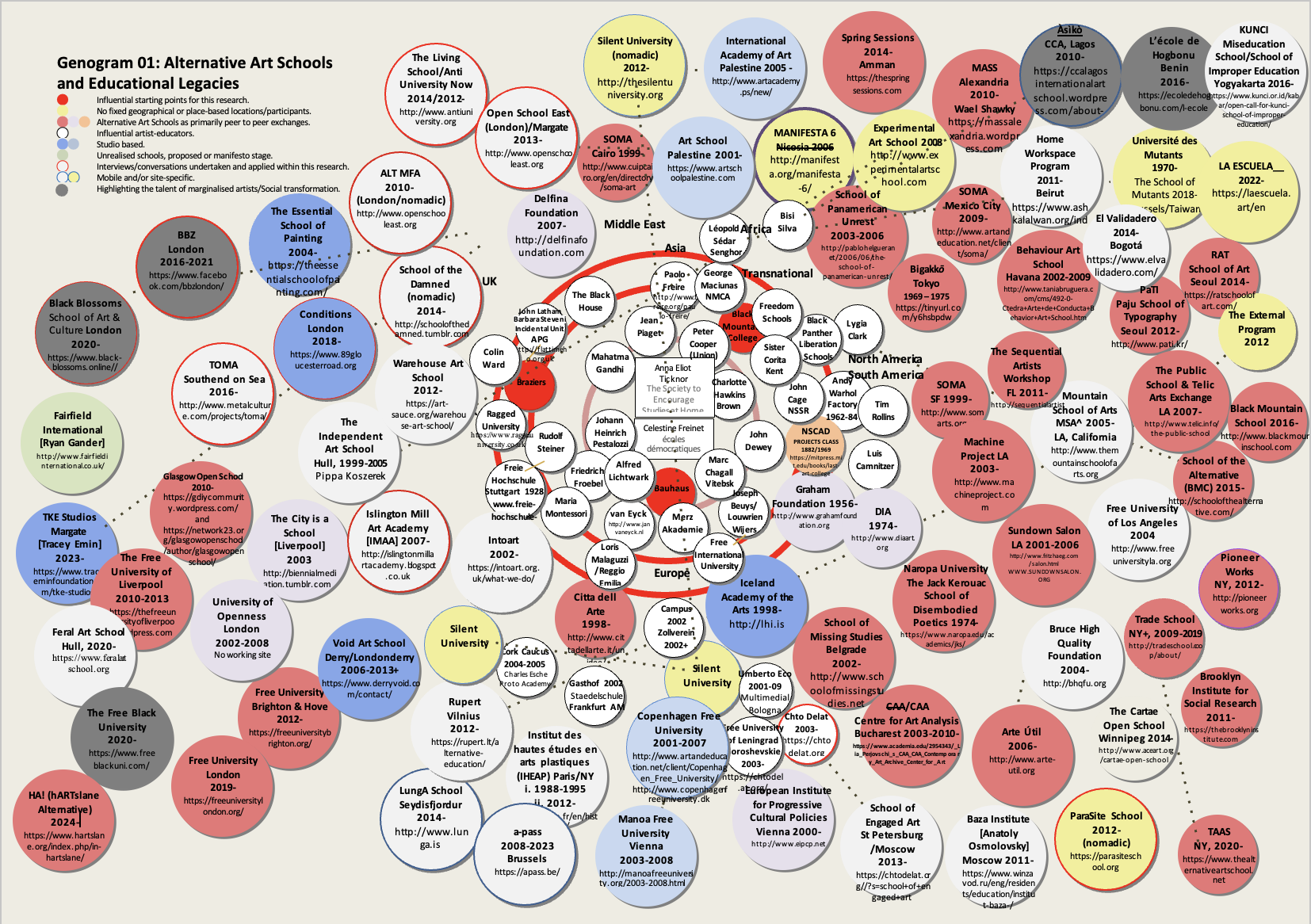 The Genograms can be used to place the alternative art schools and alternative pedagogies in dialogue with each other, for example, by combining schools offering another potential conceptualisation for an alternative art school. Within the Genograms are a number of broken lines, indicating a connection between schools. These operate across time and geographical boundaries.