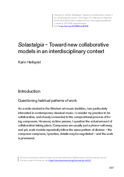 - PDF of K. Hellqvist. (2024). Solastalgia – Toward new collaborative models in an interdisciplinary context. In A.N. Hagen, R.T. Solberg, T.U. Nærland & M.F. Duch (Red.), Når musikken tek form: Om skapande praksisar i musikk (s. 207–238). Fagbokforlaget. DOI: https://doi.org/10.55669/oa491106