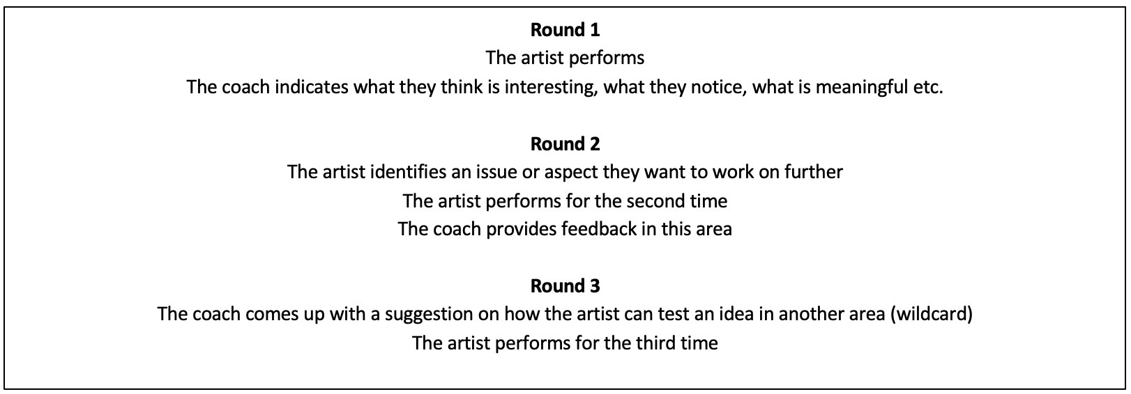 For 3WI, we adapted a variation of the CRP called Mutual Coaching that allows a pair to work reciprocally, a format particularly useful in peer-to-peer relations (Lerman 2020b). This reduces the three CRP roles to two: an artist and a coach. Originally developed to facilitate feedback during the practice of dance movement or choreography, here are the steps of Mutual Coaching:
