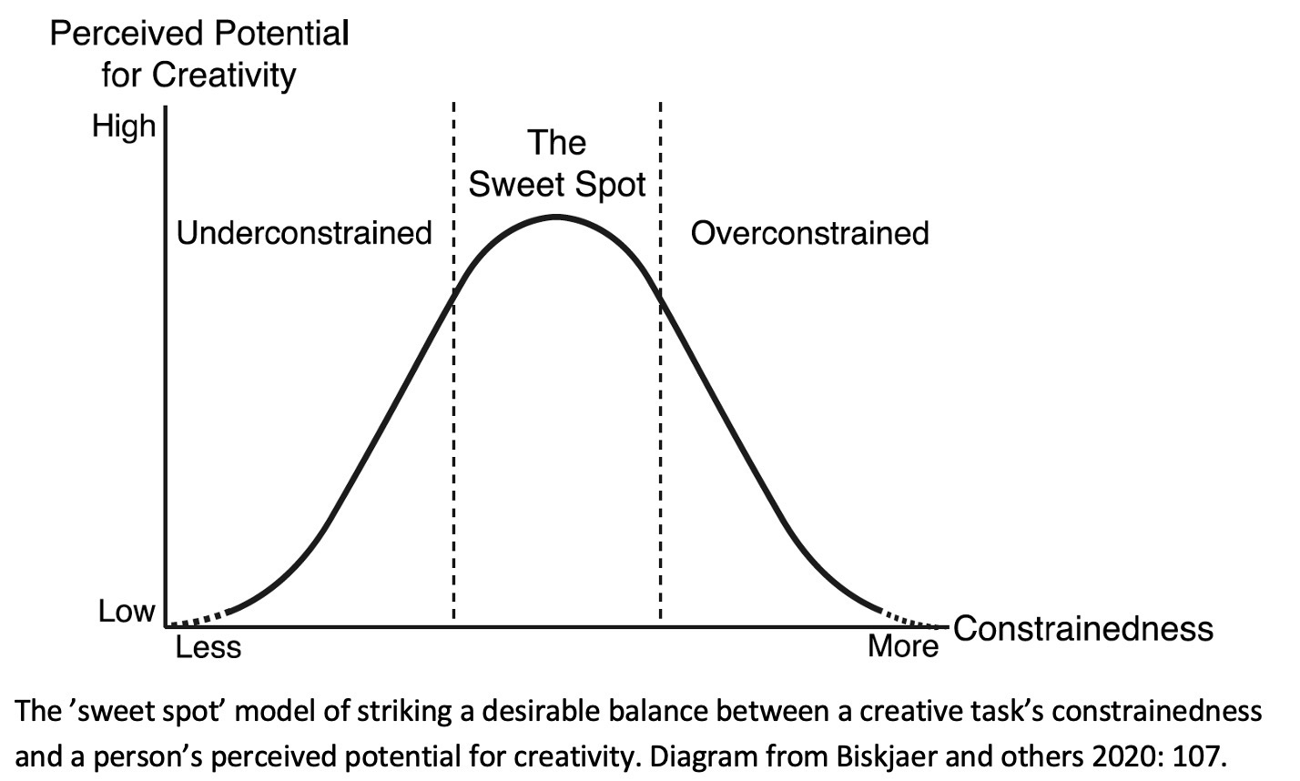 At the same time, the act of constraining must strike a balance to be most generative. A creative process can become over-constrained, just as it may (initially) be under-constrained: a ‘too high level of constrainedness (too little creative freedom) will make it hard for the person involved to initiate a resolution of a creative task, since it is cognitively more difficult to process all the given task constraints’ (Biskjaer and others 2020: 6).