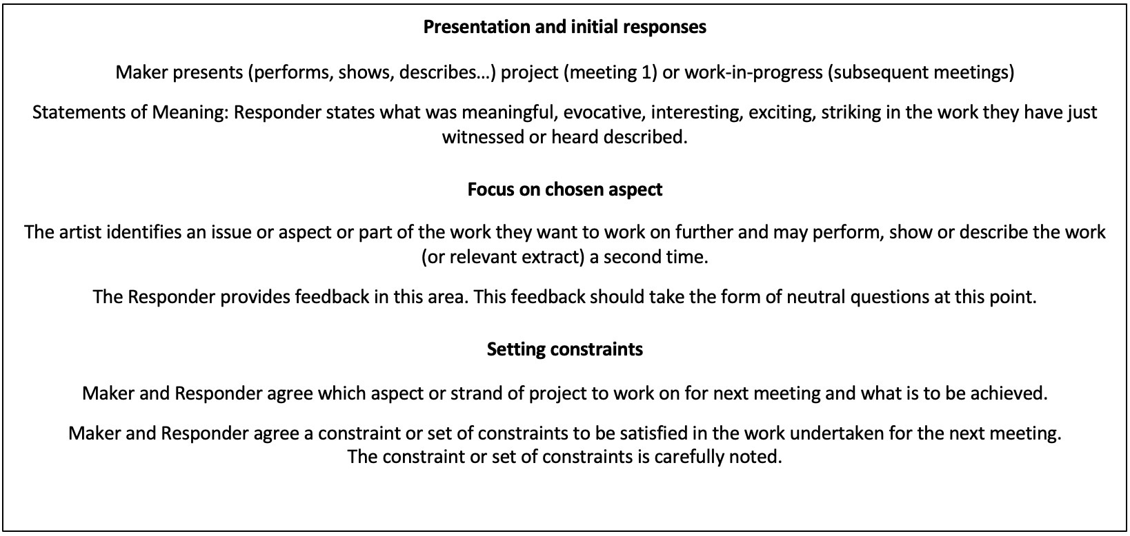 In its original form, the CRP is a four-step process that involves the three roles of artist/maker, responders, and facilitator. In step one, following the sharing of the work-in-progress, responders state what they find striking in the work concerned. In step two, the artist asks questions about the work-in-progress to elicit responses in relation to an aspect they wish to develop. In step three, the audience address neutral questions (questions that do not disguise a value judgement) to the artist. Finally, in step four, the responders may offer to voice opinions about some aspect of the work, but only by invitation of the artist. Trust is built between artists and responders as the steps progress and responders become familiar with the goals of the artist (Lerman 2020a).